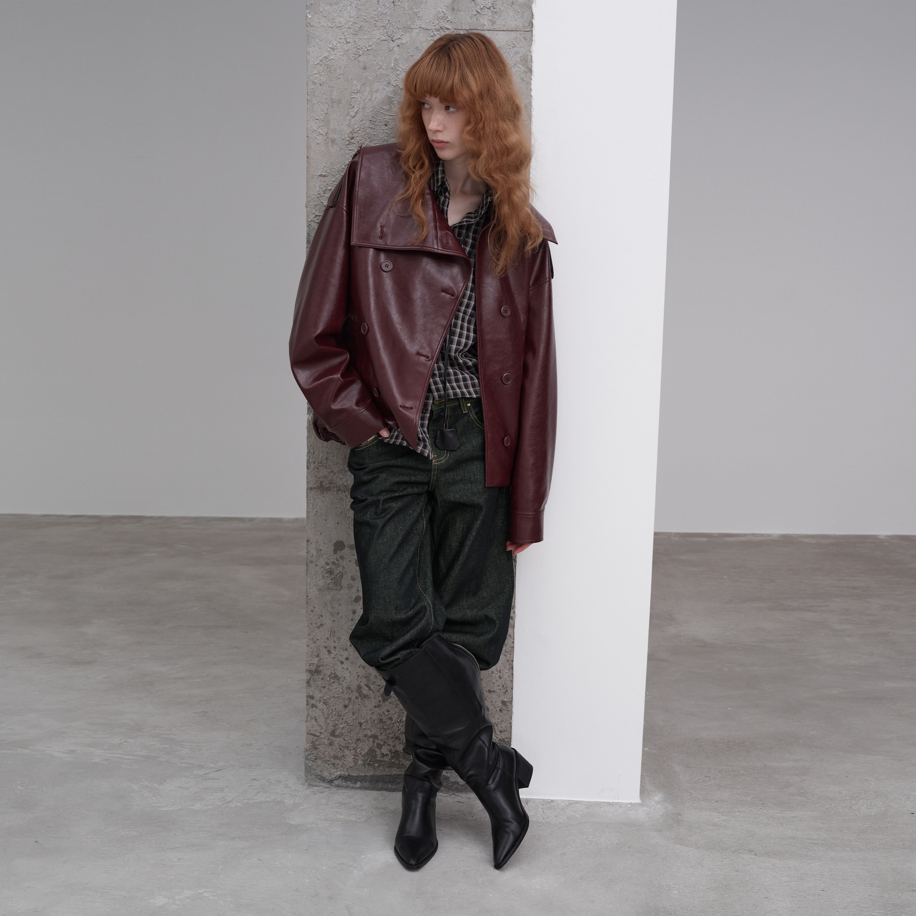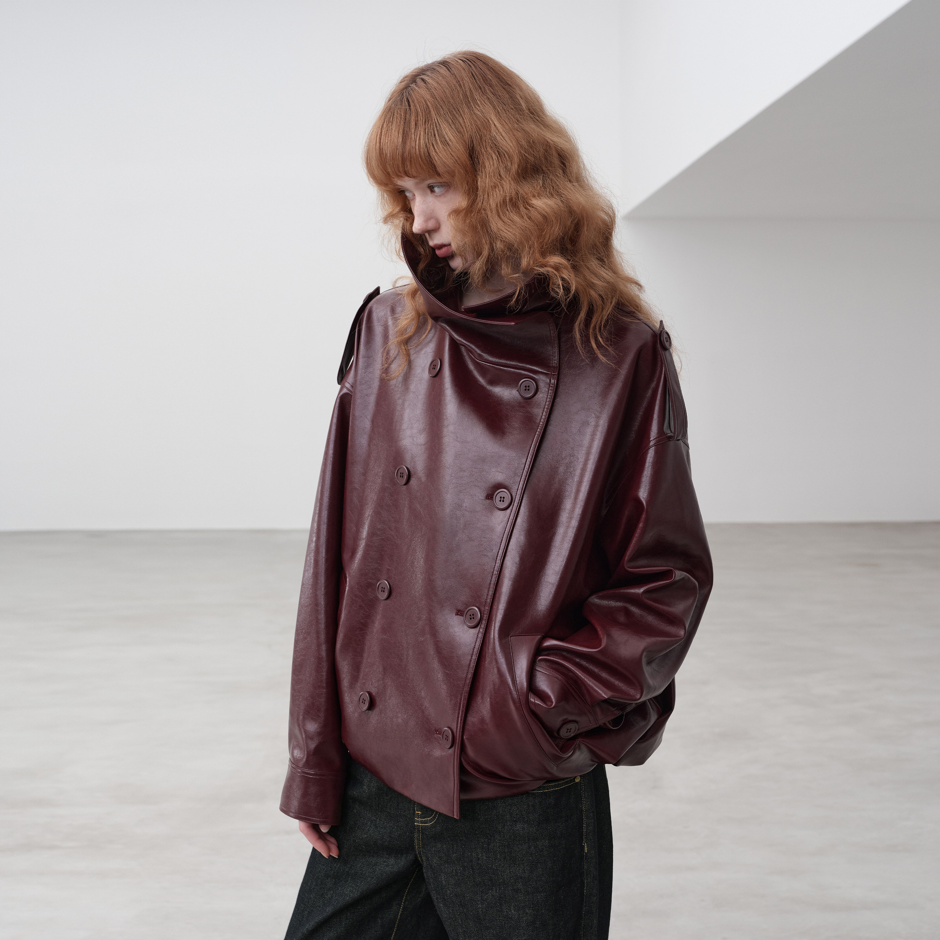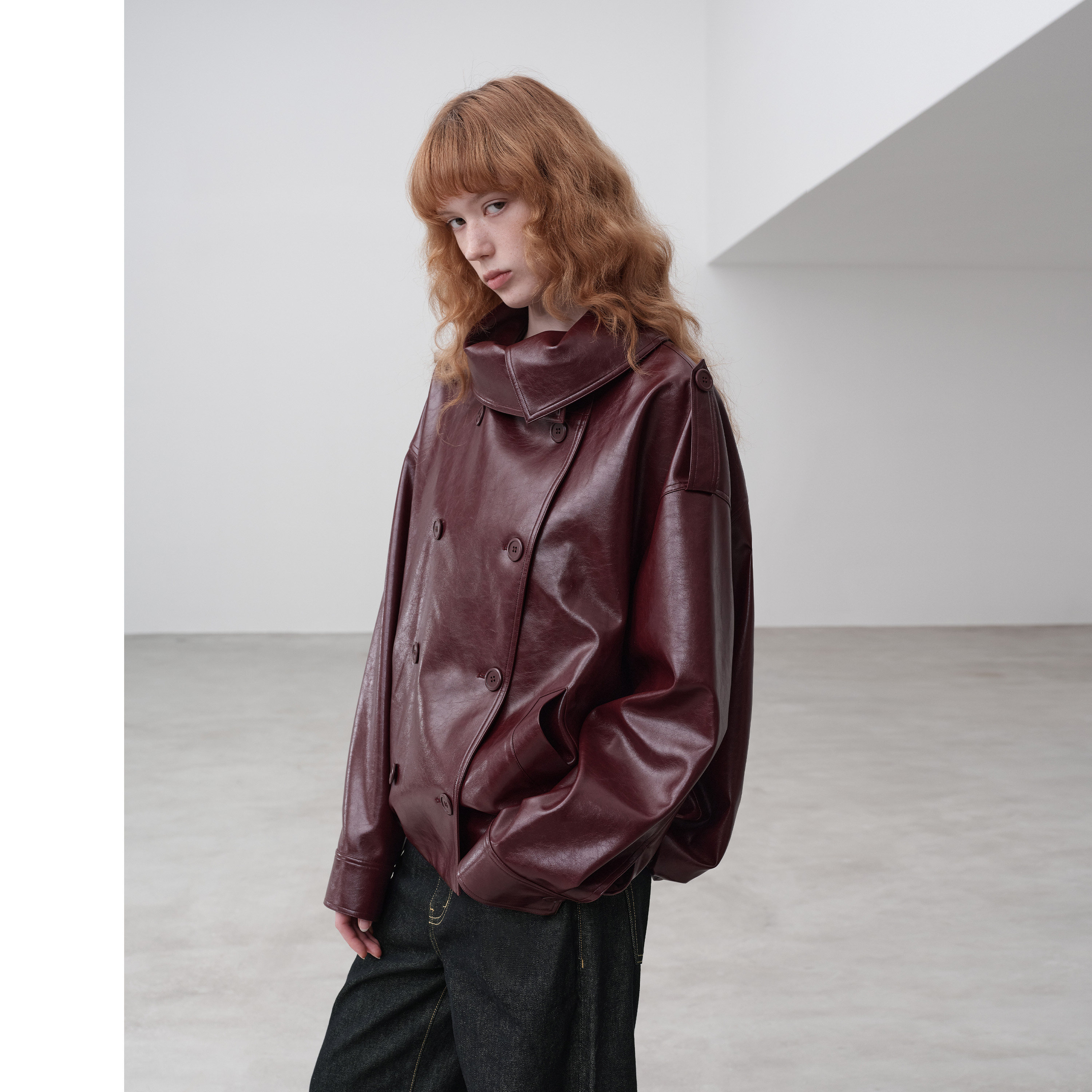 昆士兰黑 OfAkiva 极简廓形皮衣女云朵下摆绗棉皮大衣 现货