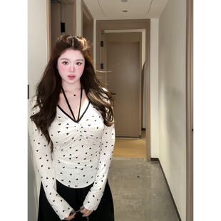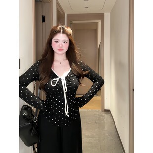 显瘦绝美上衣女 T恤早秋新款 大码 胖mm辣妹风撞色设计感v领系带长袖
