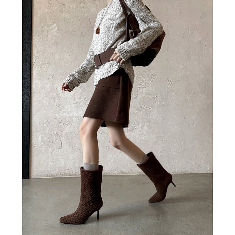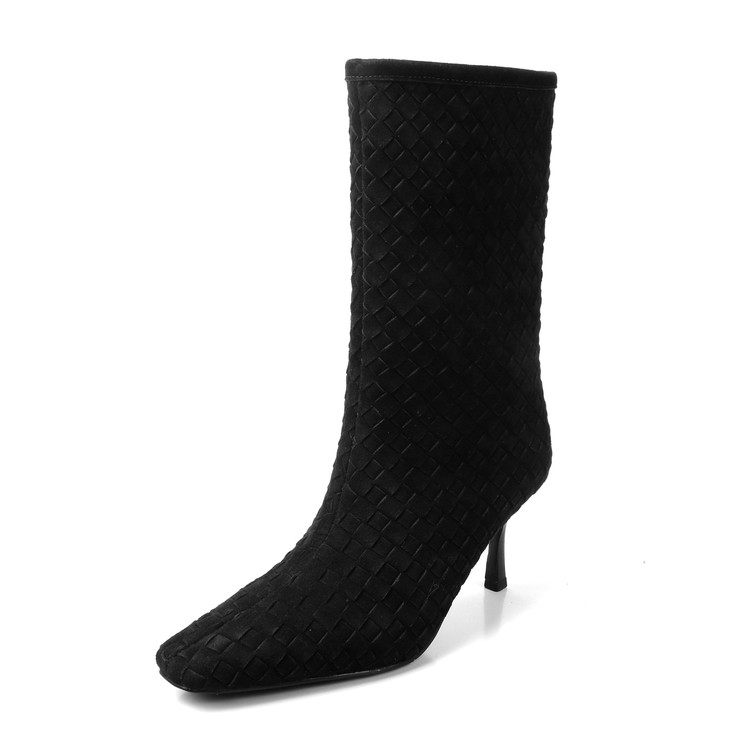 靴子 风编织套筒时装 7cm时尚 方头高跟中筒骑士靴2025百搭纯色韩版