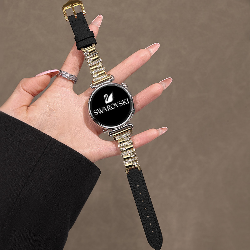 适用华为GT6手表带施华洛闪钻watchgt5表带拼皮质gt5pro真皮watch5荔枝纹gt4女春夏轻奢高级感 黑天鹅镶钻