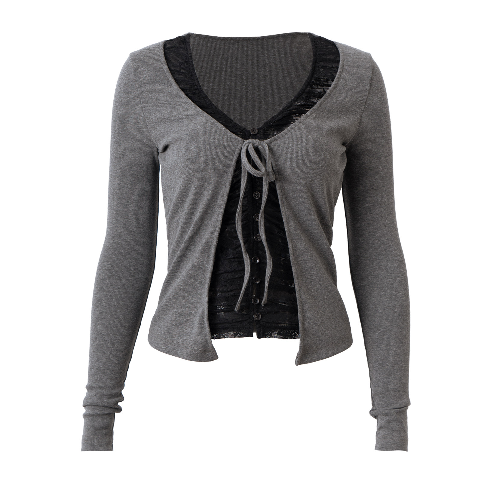 针织T恤纯欲镂空上衣 白色假两件V领拼蕾丝系带开衫 PynkiSwear 灰