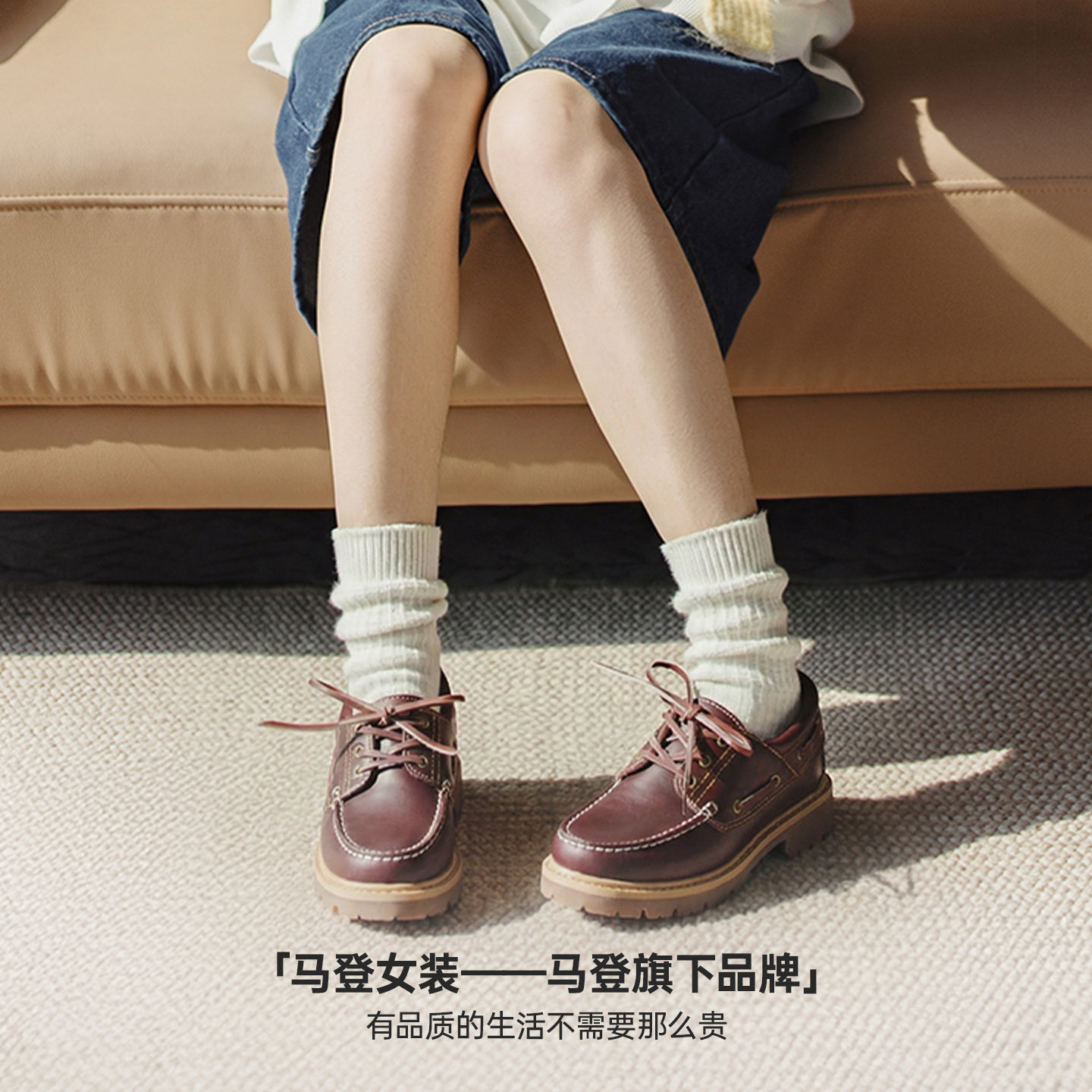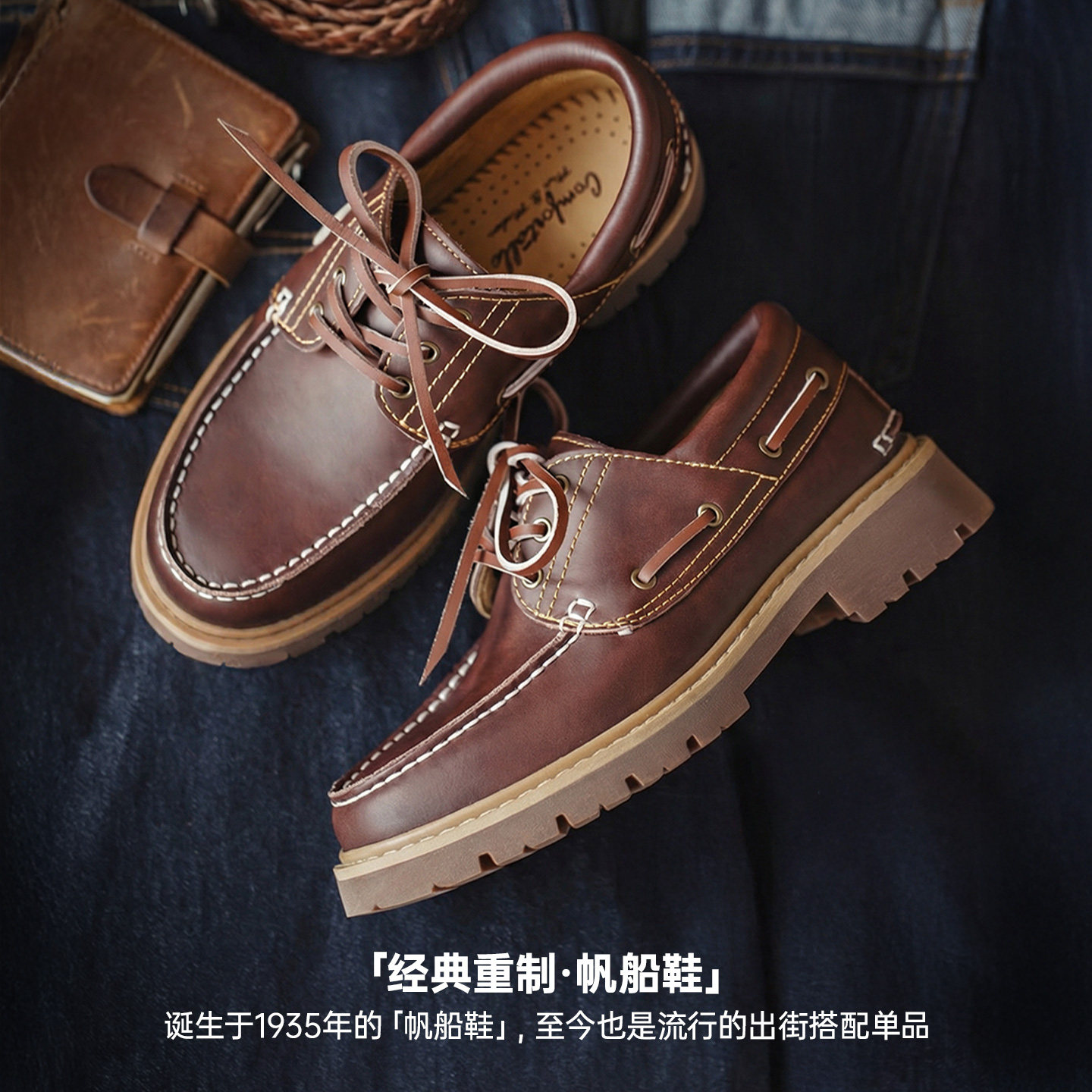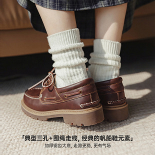 真牛皮单鞋 帆船鞋 女春夏 圆头平底乐福鞋 马登复古红棕色老钱风皮鞋