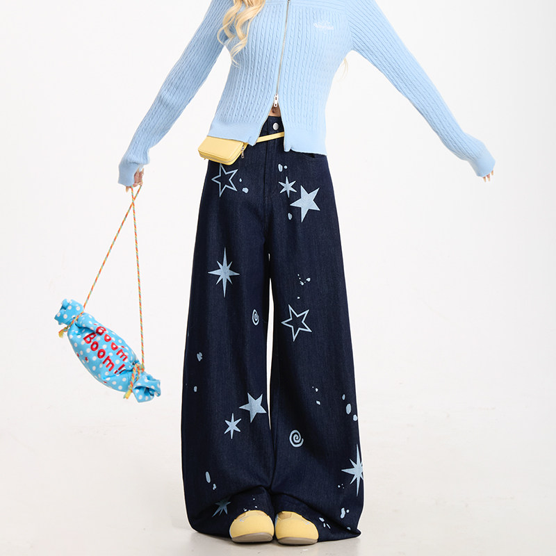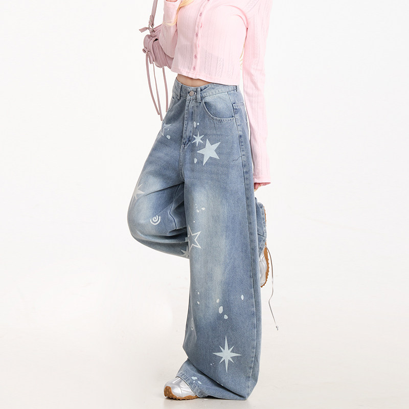 复古垂感百搭阔腿裤 星星印花水洗弯刀牛仔裤 子女美式 NERESUM裤