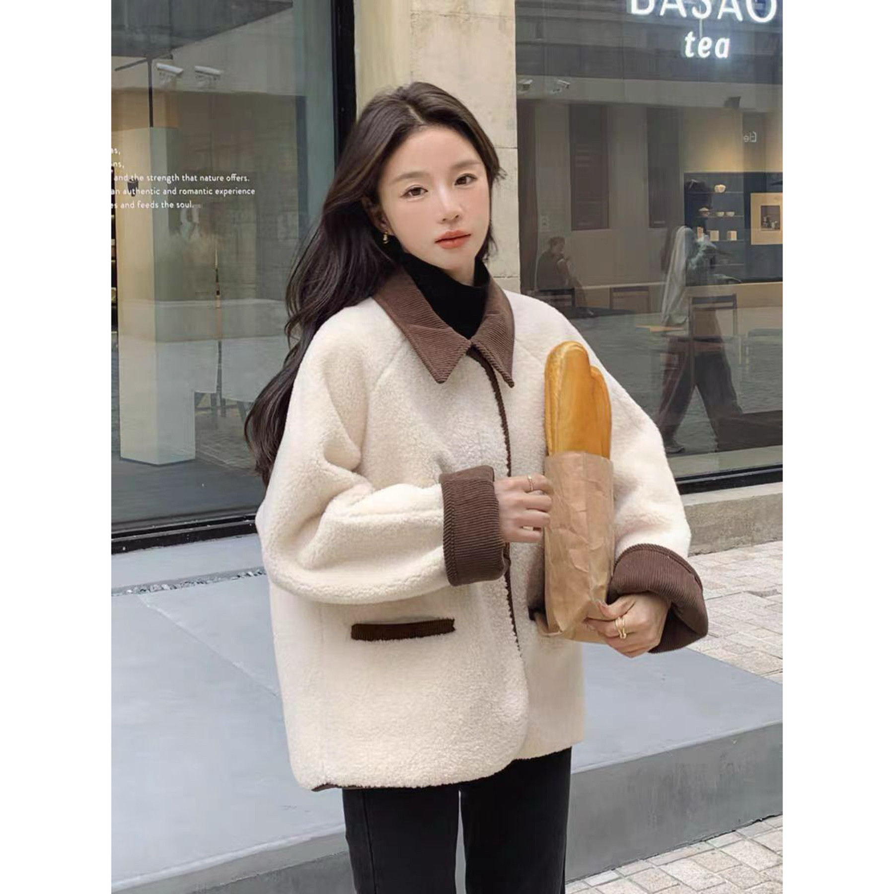 宽松加厚皮毛一体棉服 韩版 米白色小香风羊羔毛外套女2025冬季 新款