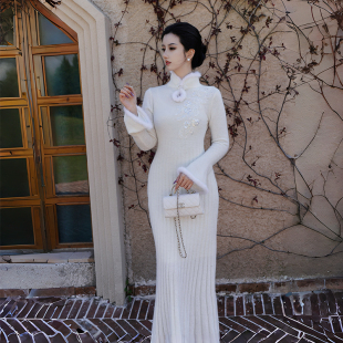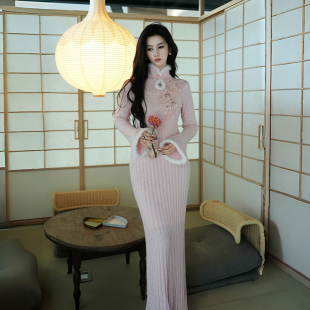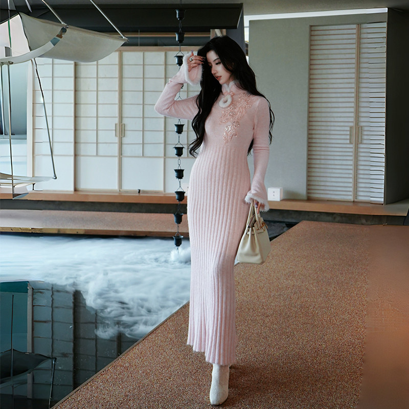 玉白盈粉美利奴羊毛水貂旗袍针织连衣裙 新中式 澄渔高定 洛神赋