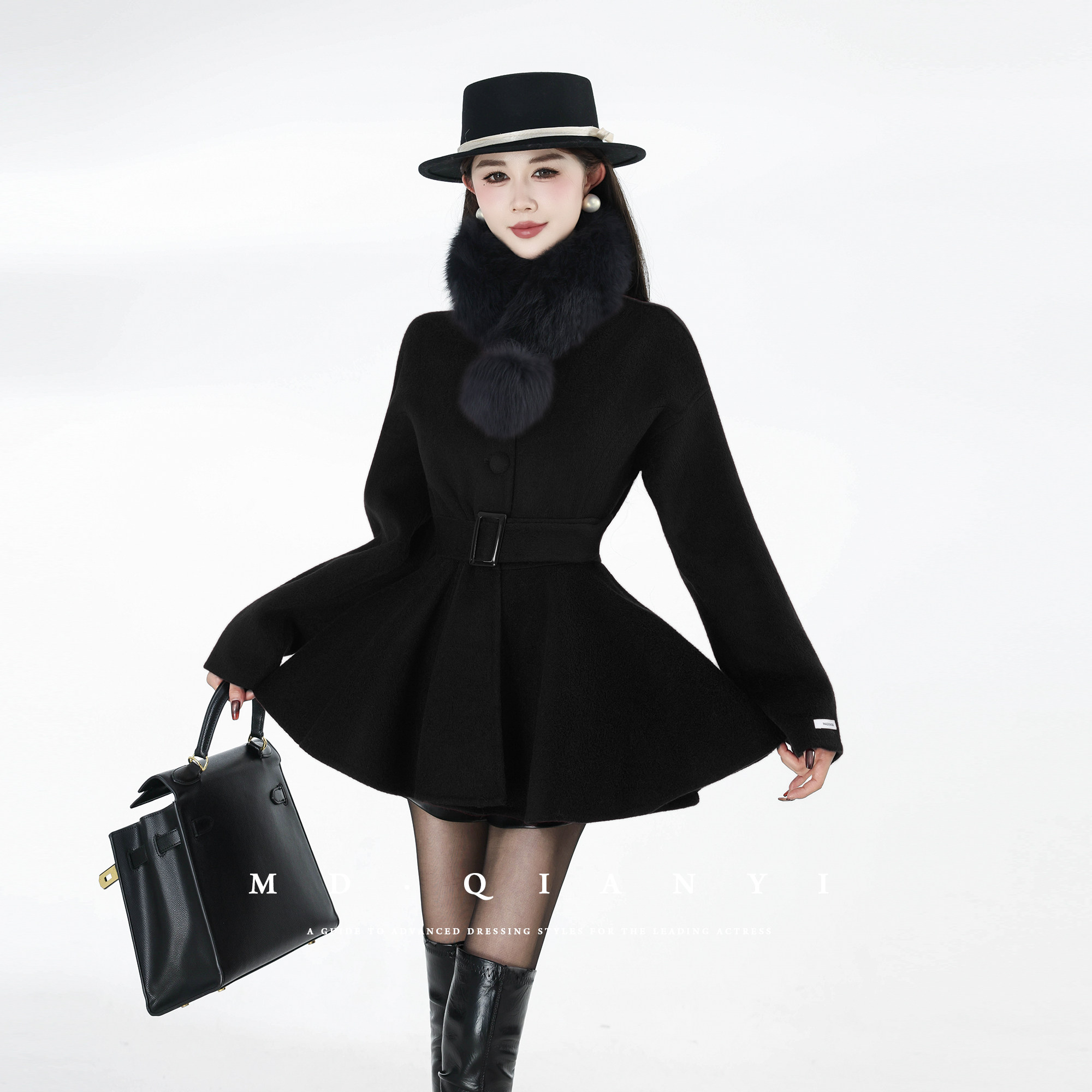胖mm特大码 毛呢外套 黑色赫本风呢子大衣女秋冬高级感慵懒风中长款