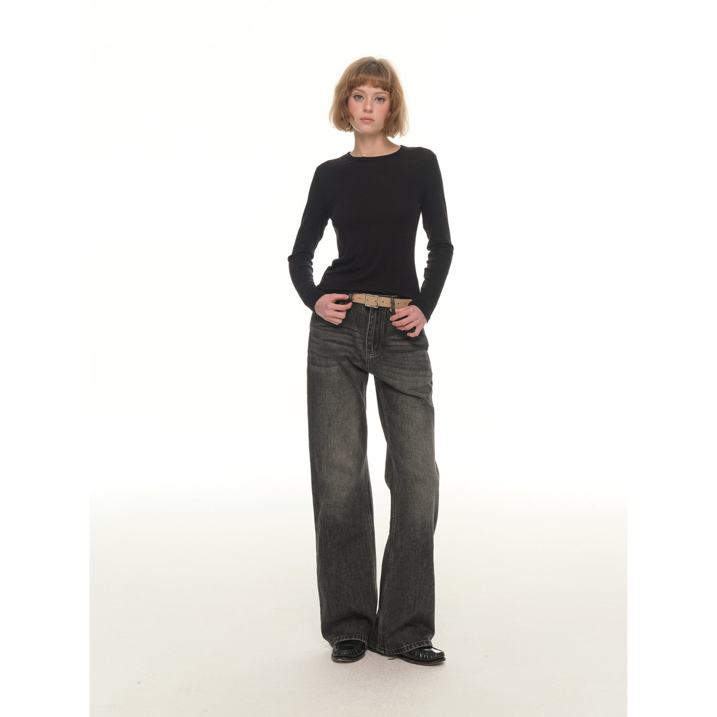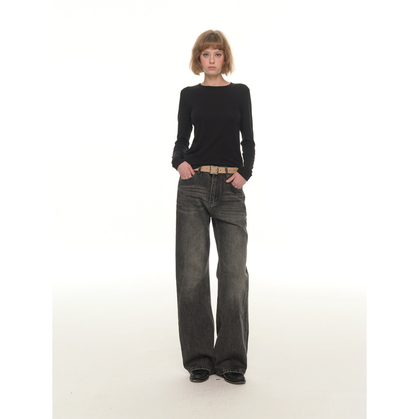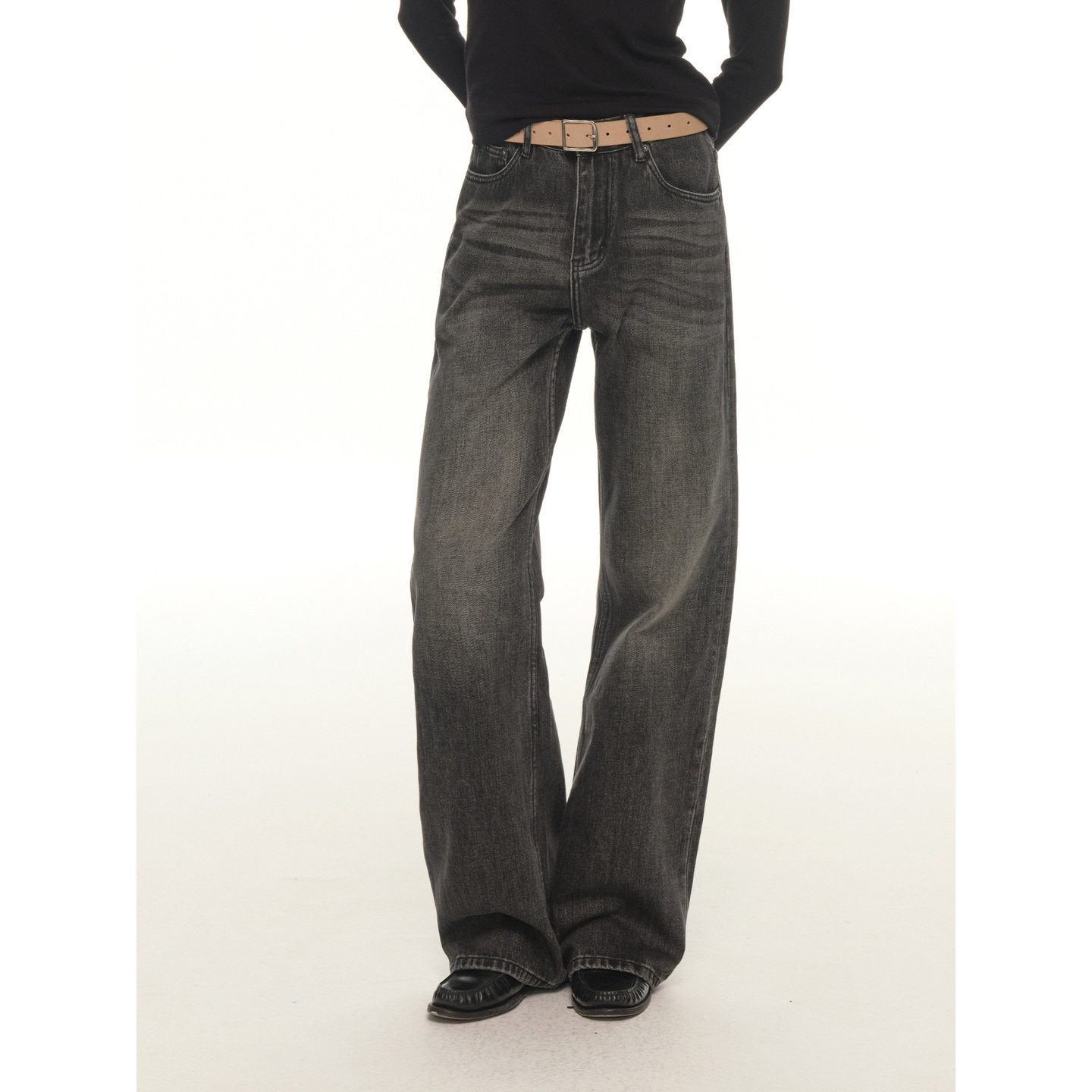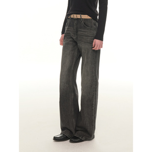 高腰宽松阔腿微喇休闲裤 UNRETRO 女冬季 复古水洗做旧牛仔裤 美式