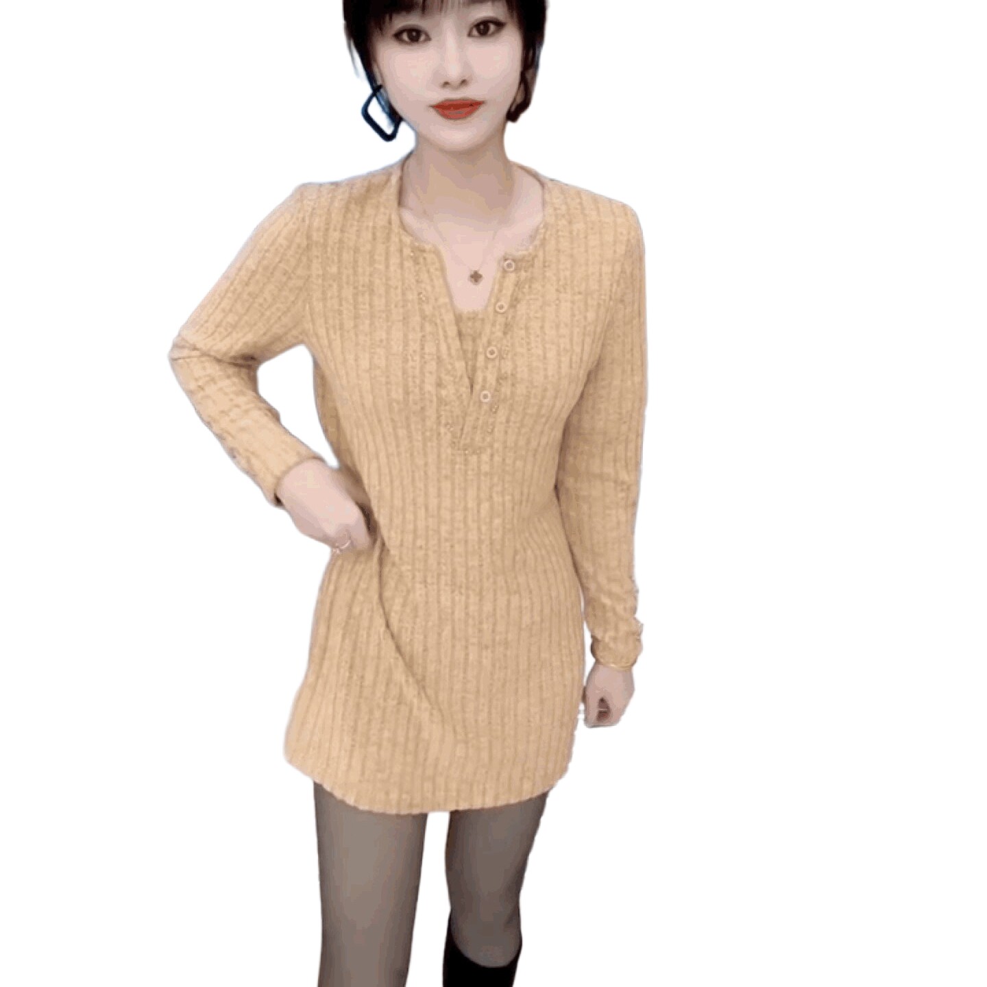 上衣圆领宽松遮肉打底衫 串珠时尚 女坑条针织遮臀法式 T恤衫 中长款