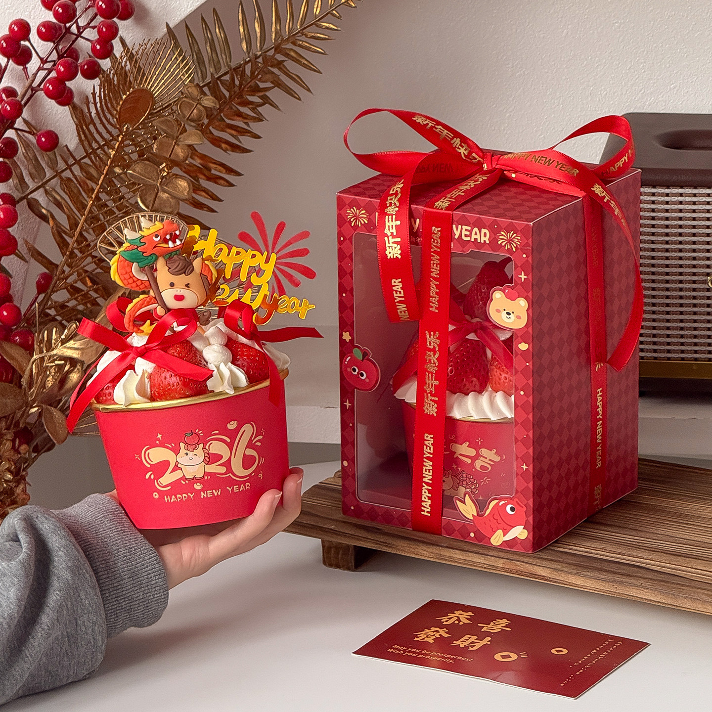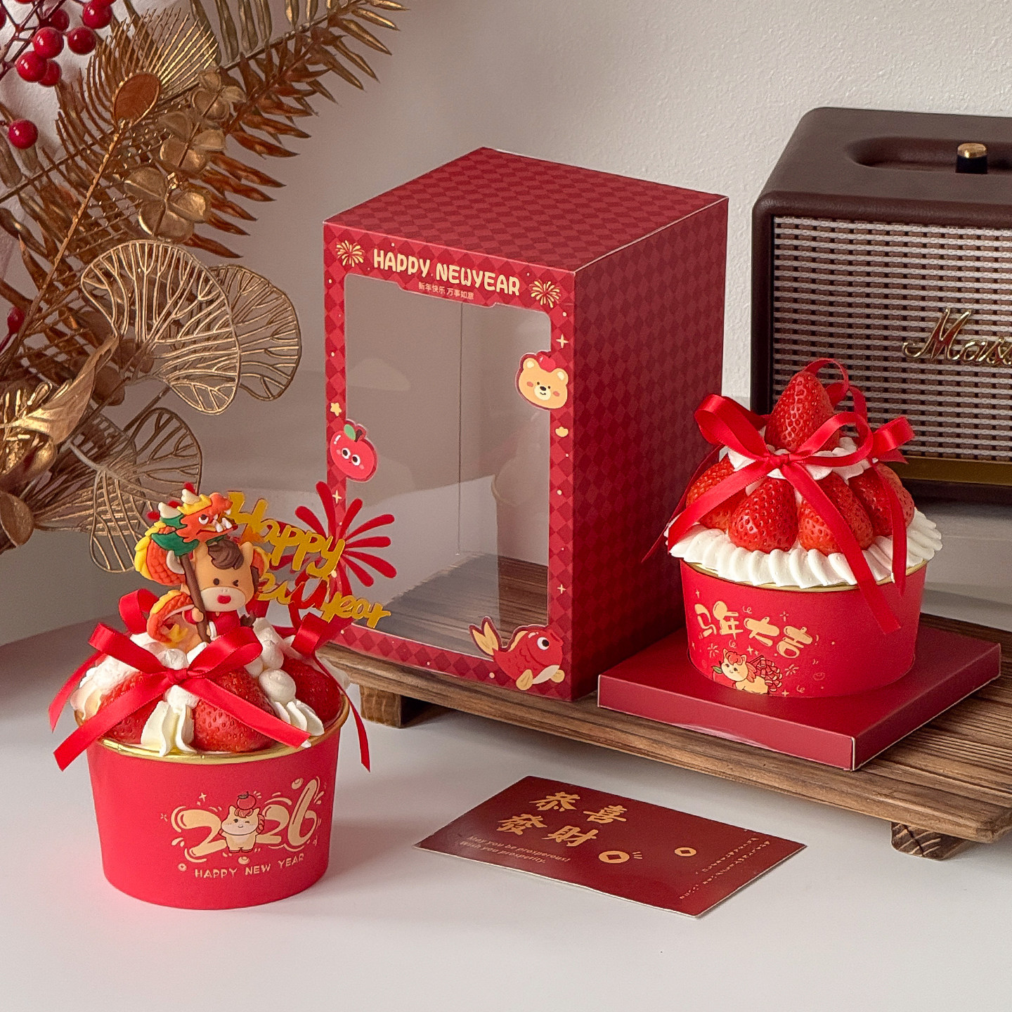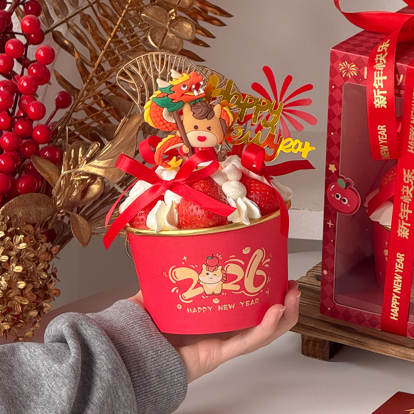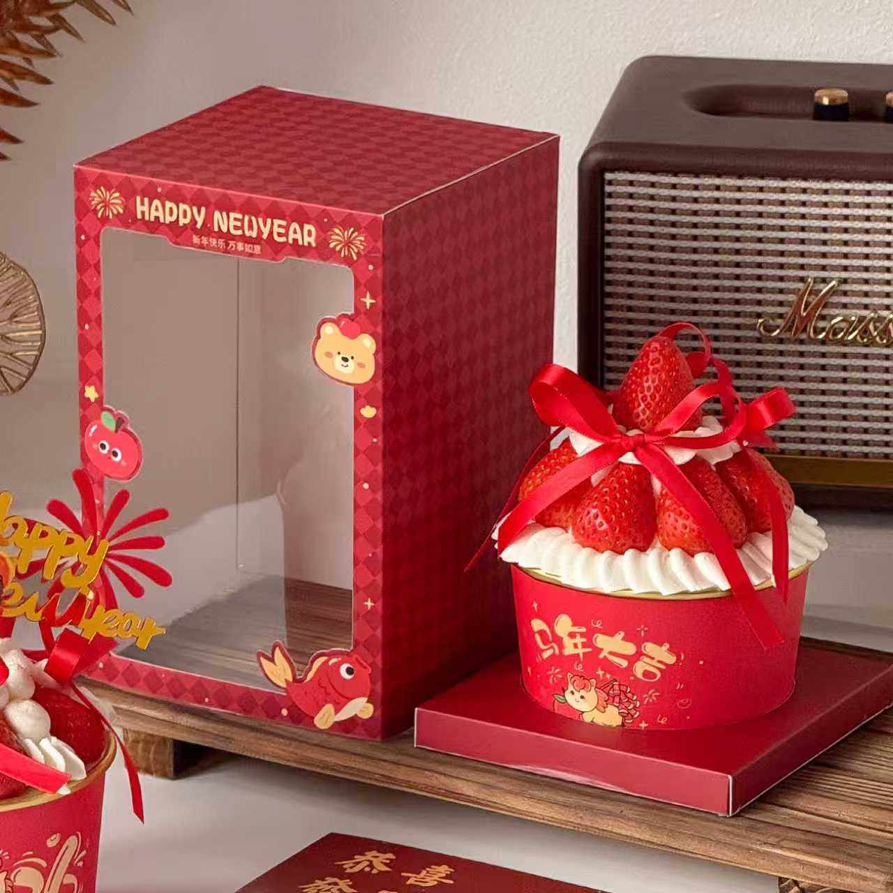 跨年一次性碗草莓蛋糕装 盒 饰马年2026新年快乐加厚食品级纸碗包装