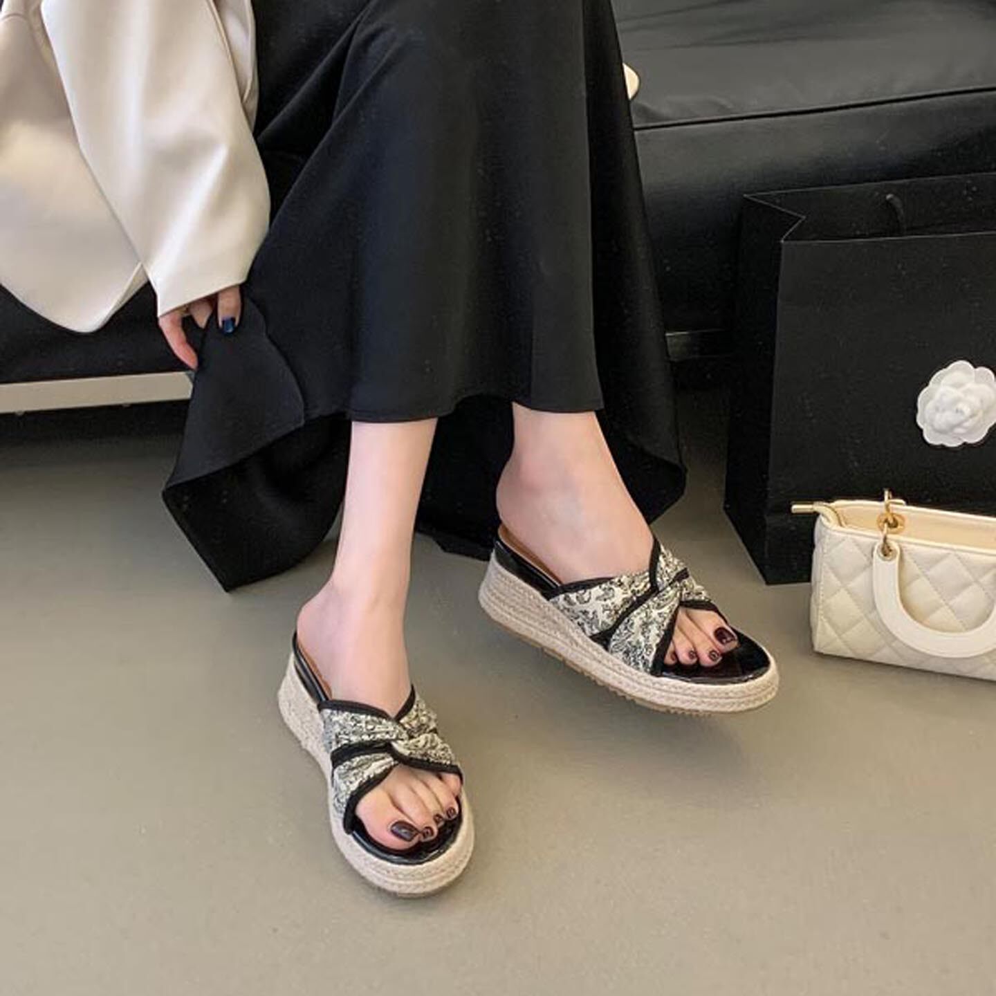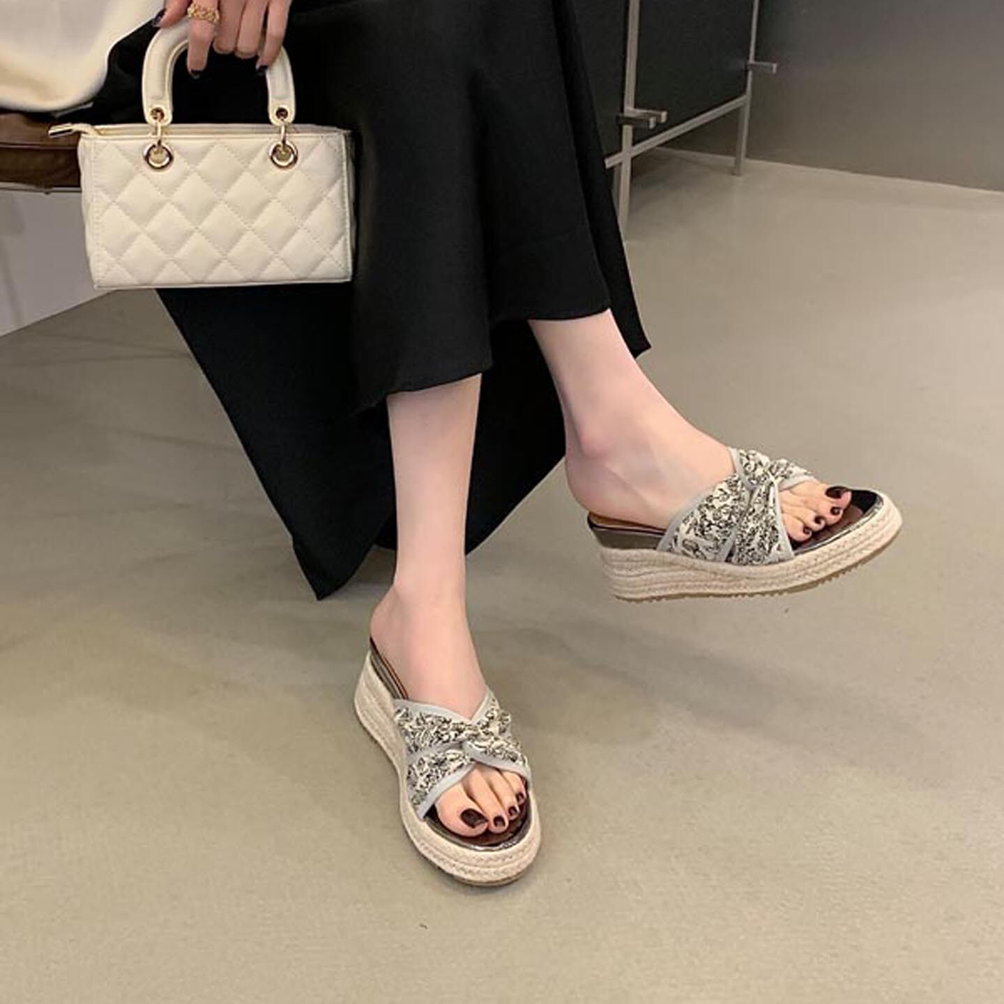 露趾麻绳草编高跟凉鞋 2026夏季 女外穿厚底一字拖鞋 坡跟凉拖鞋 新款