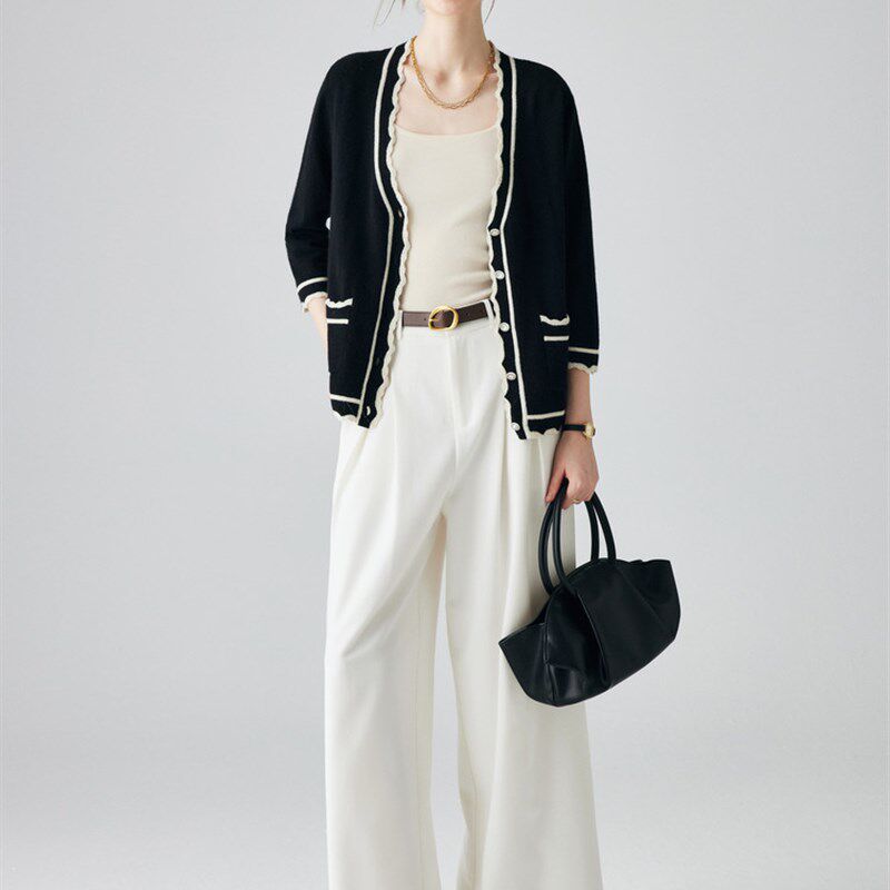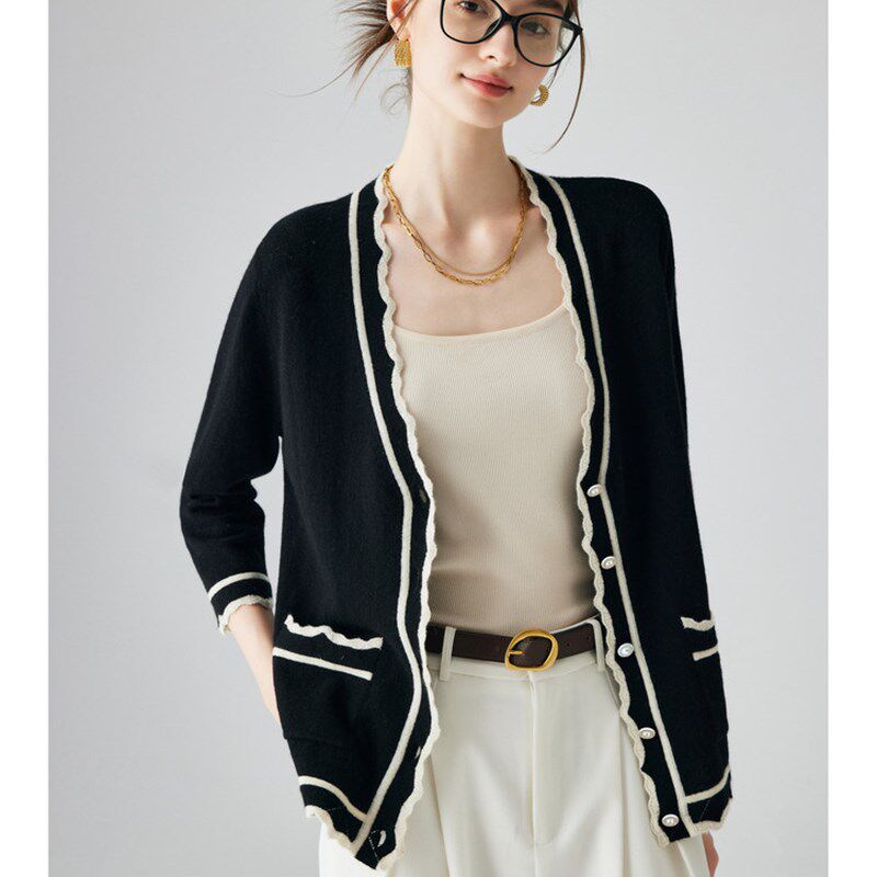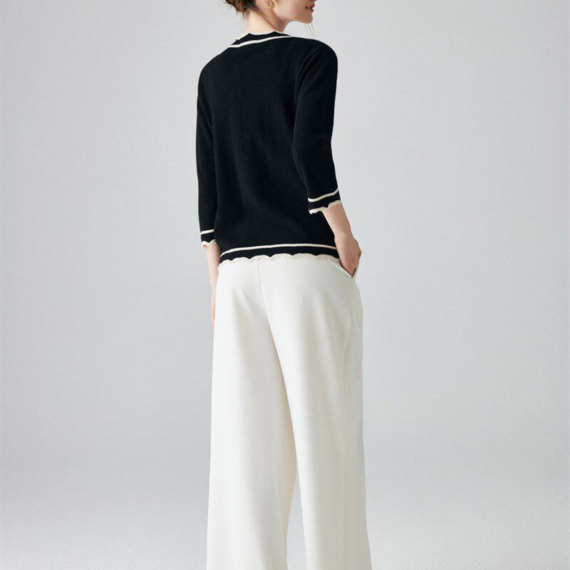 七分袖 女装 毛衣 甜美撞色花边针织100%纯山羊绒开衫 帕罗25秋冬新款