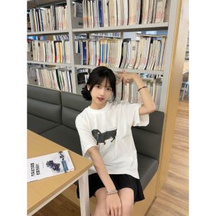 复古狗狗印花短袖 宽松型美式 T恤男女宽松白色纯棉上衣潮 韩版 夏季