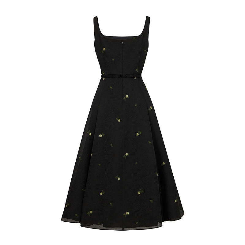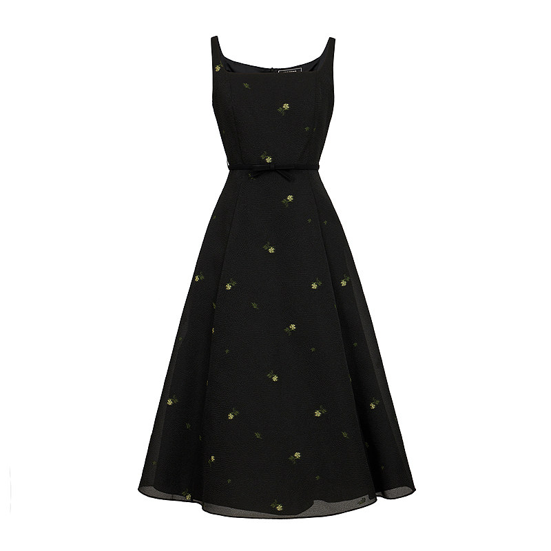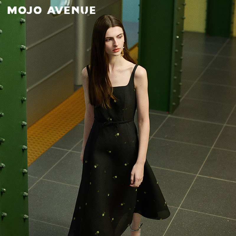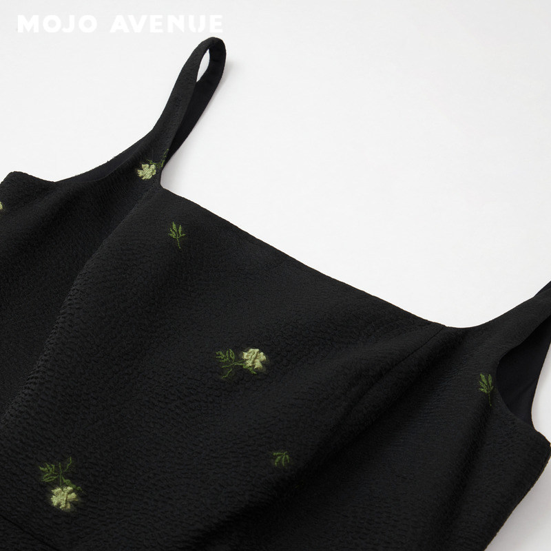 法式 MOJO夏新品 朗姿 优雅小黑裙花卉刺绣吊带中长裙 山茶系列