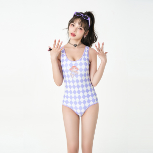 奔赴夏日泳衣女夏卡通小人紫色新款 保守可爱显瘦T遮肚温泉连体泳