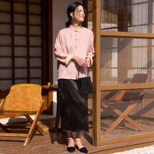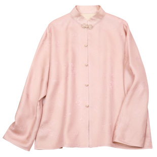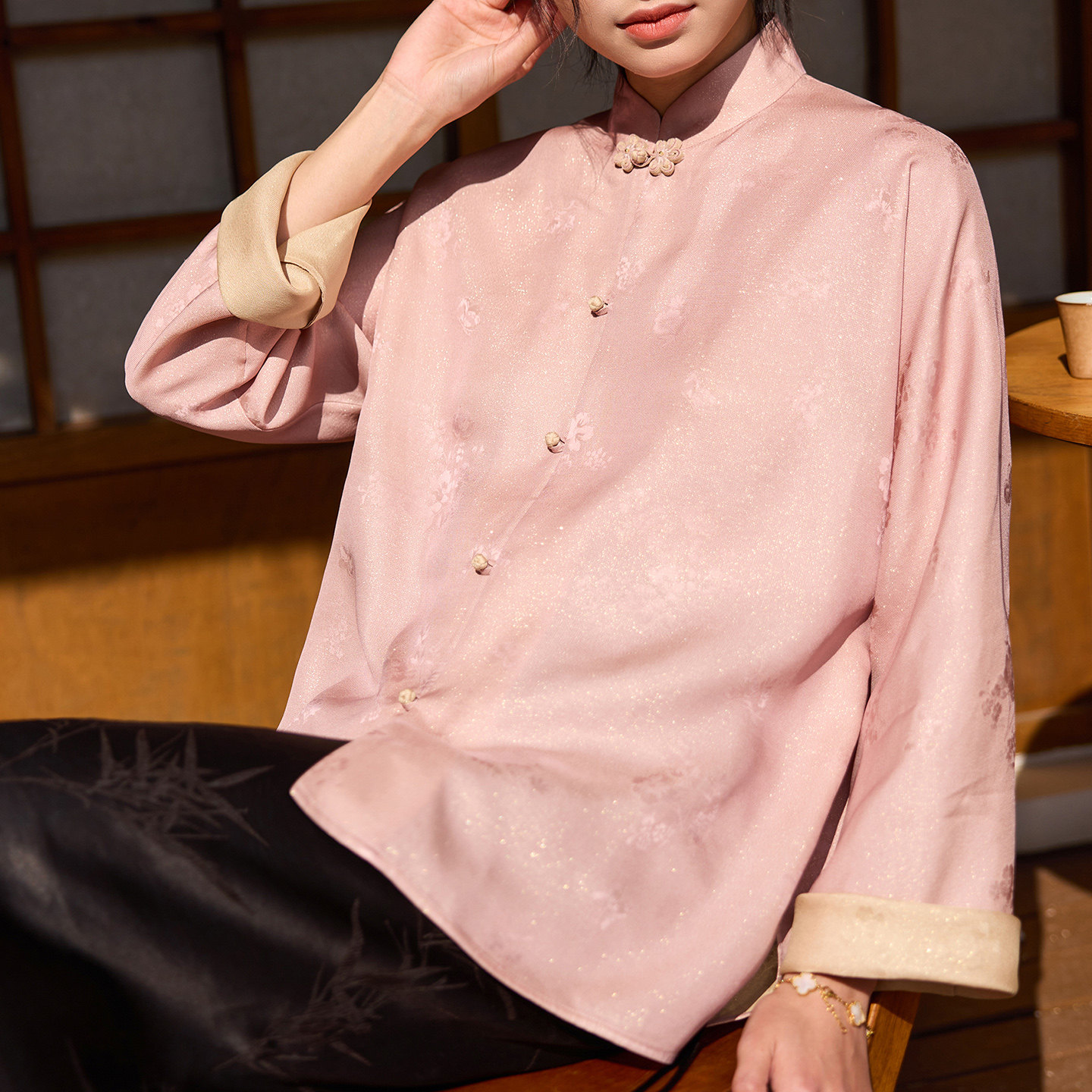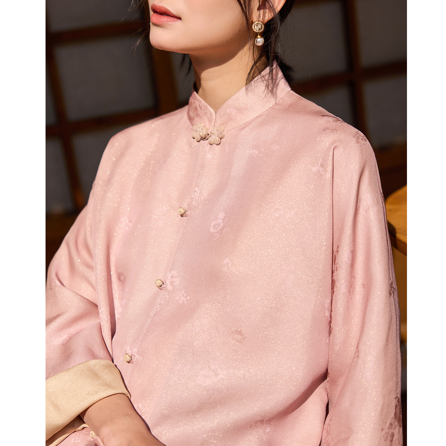 菲伊唐真丝织金花萝双色春女上衣新中式 复古对襟改良立领显瘦衬衫