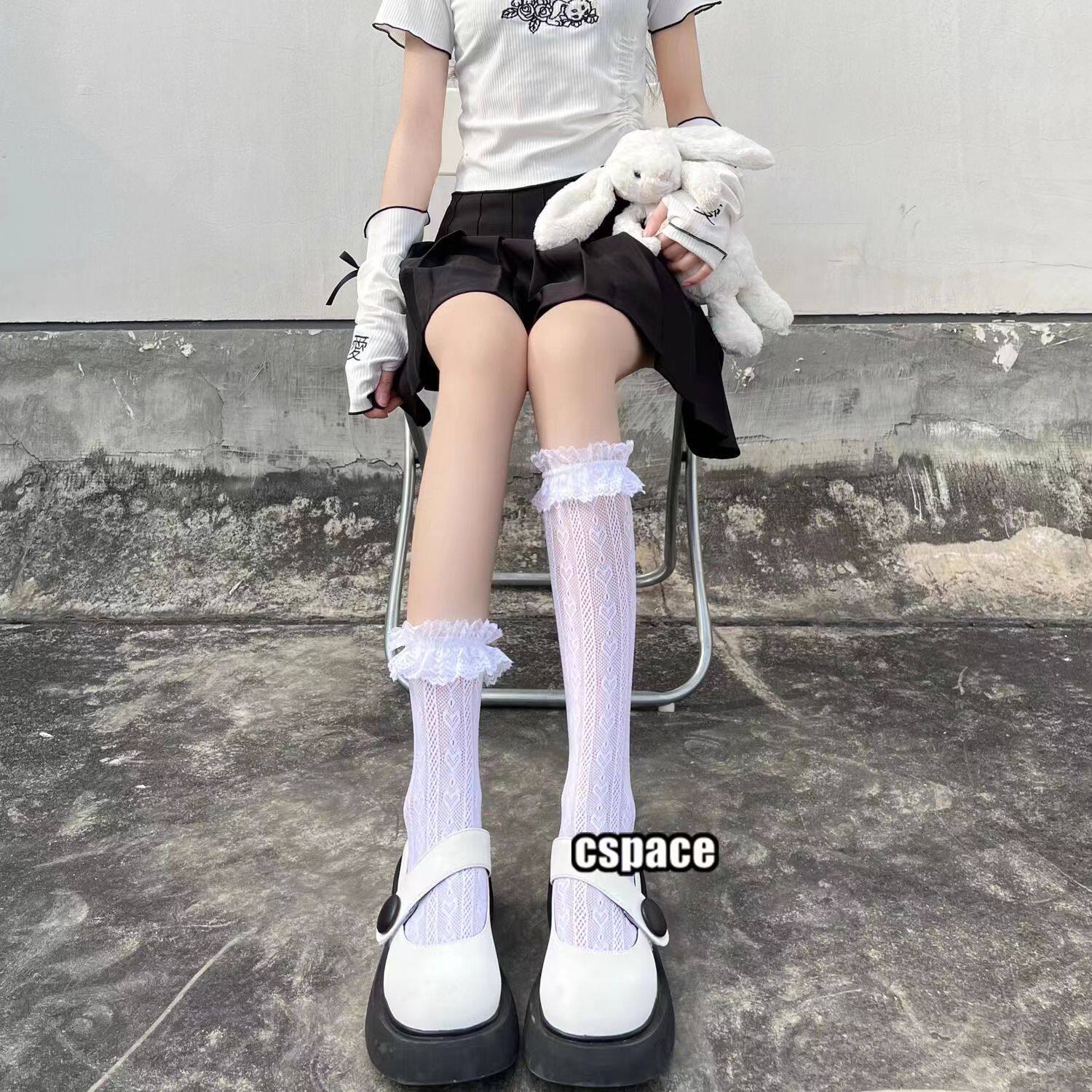 花边竖条爱心袜女薄款 可爱白色镂空袜jk袜