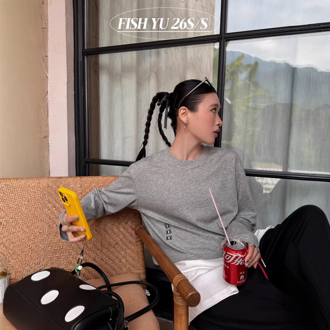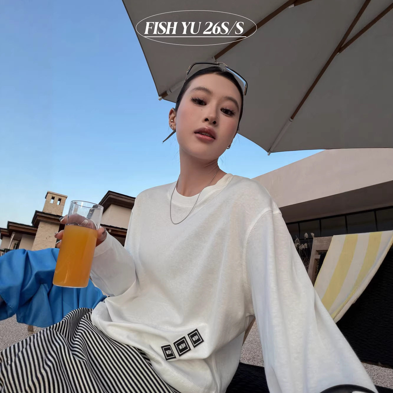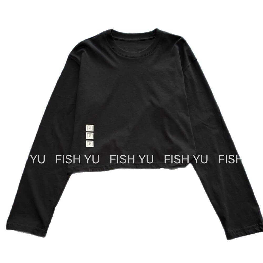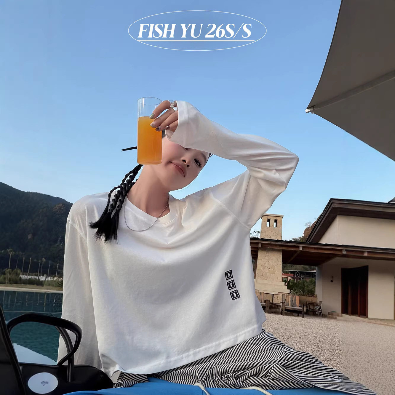 t恤女夏学生短款 FISHYU 简约宽松烫图小个子休闲长袖 薄款 上衣 韩版