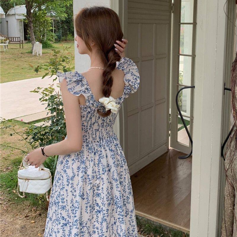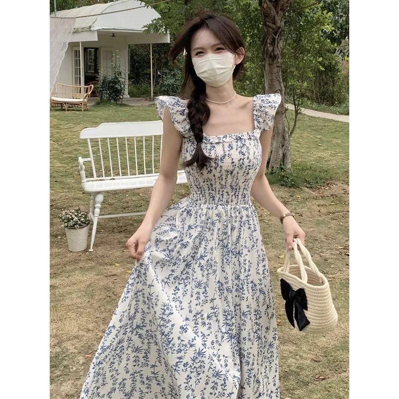 小清新蓝色碎花吊带裙女2023夏季 连衣裙女 甜美收腰气质显瘦小飞袖