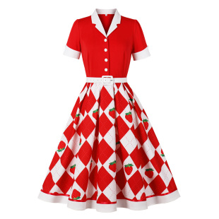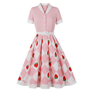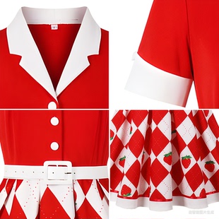 显瘦女装 欧美复古红色几何印花草莓拼接西装 大码 短袖 连衣裙 领衬衫
