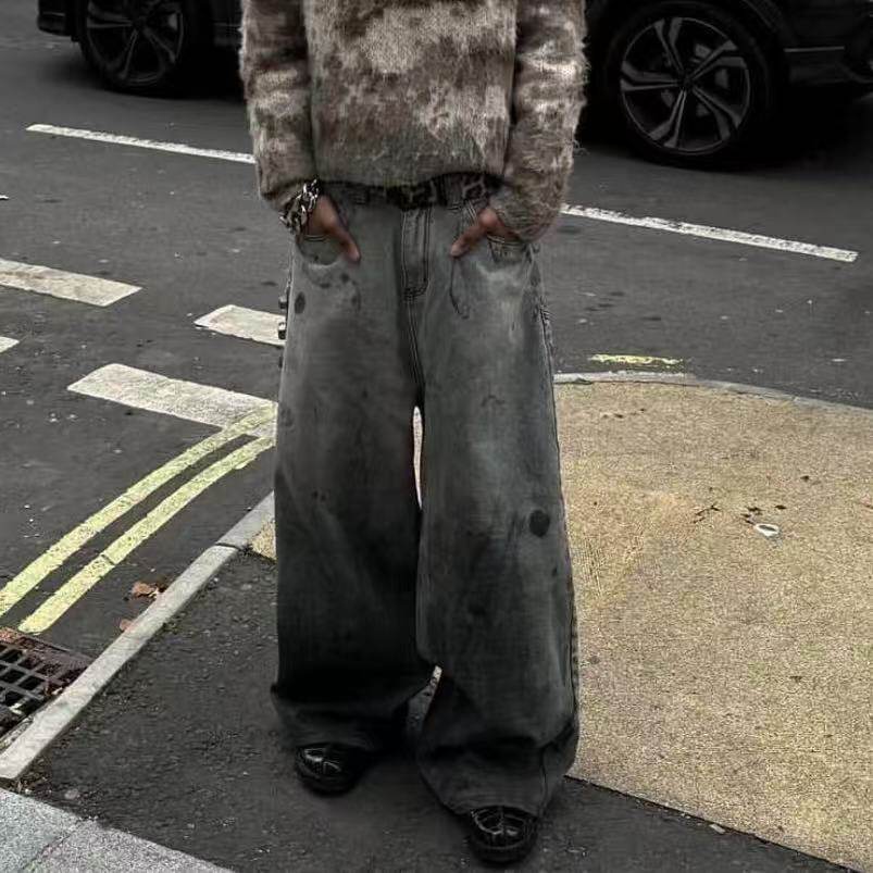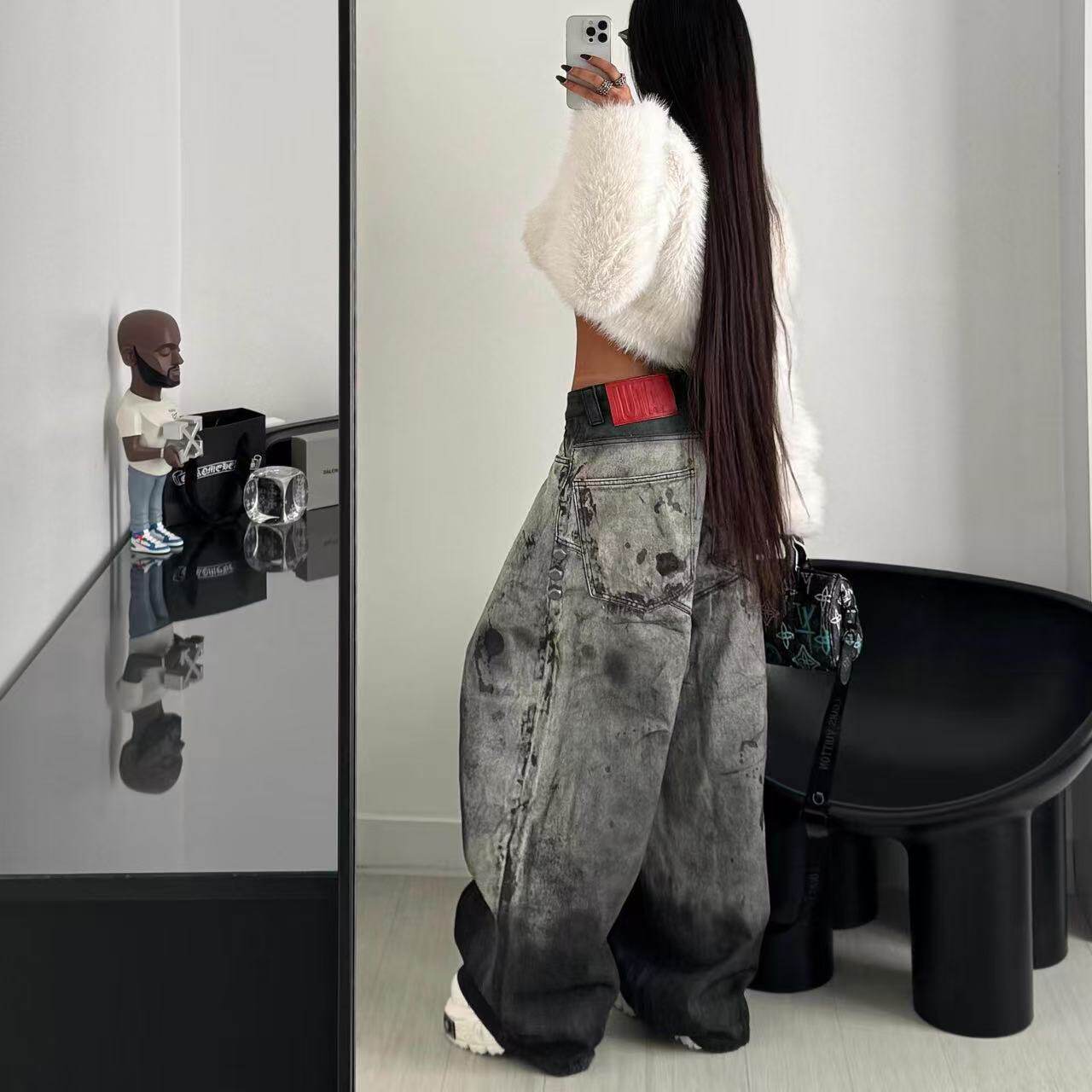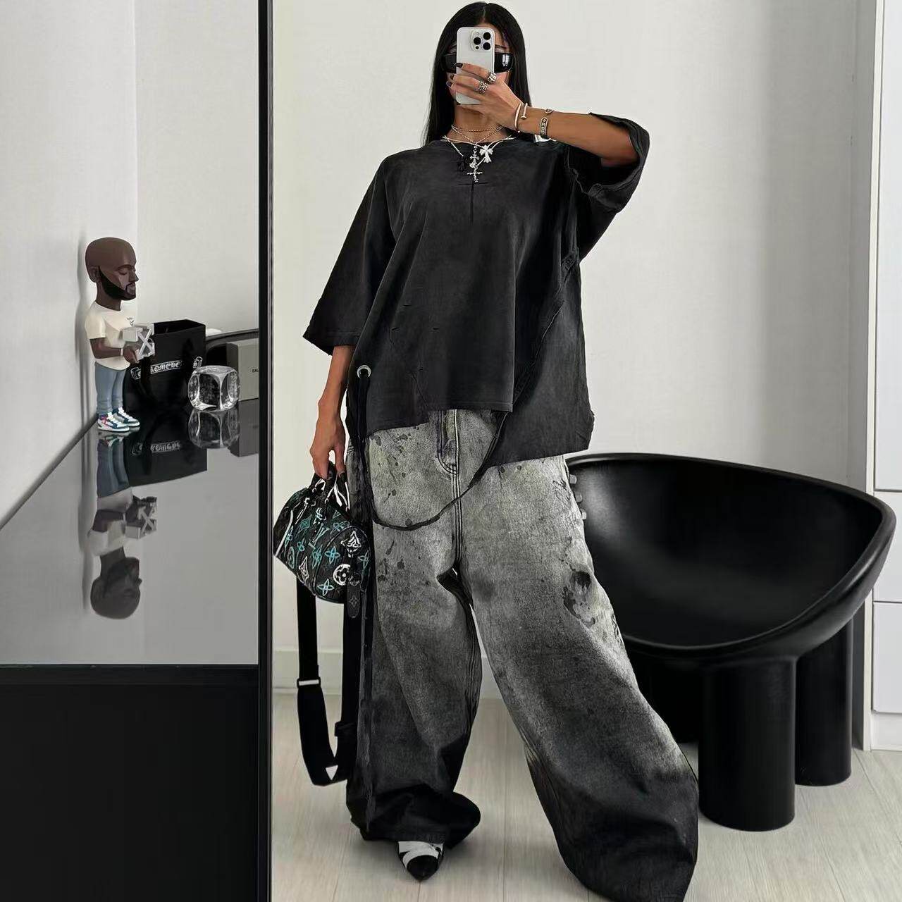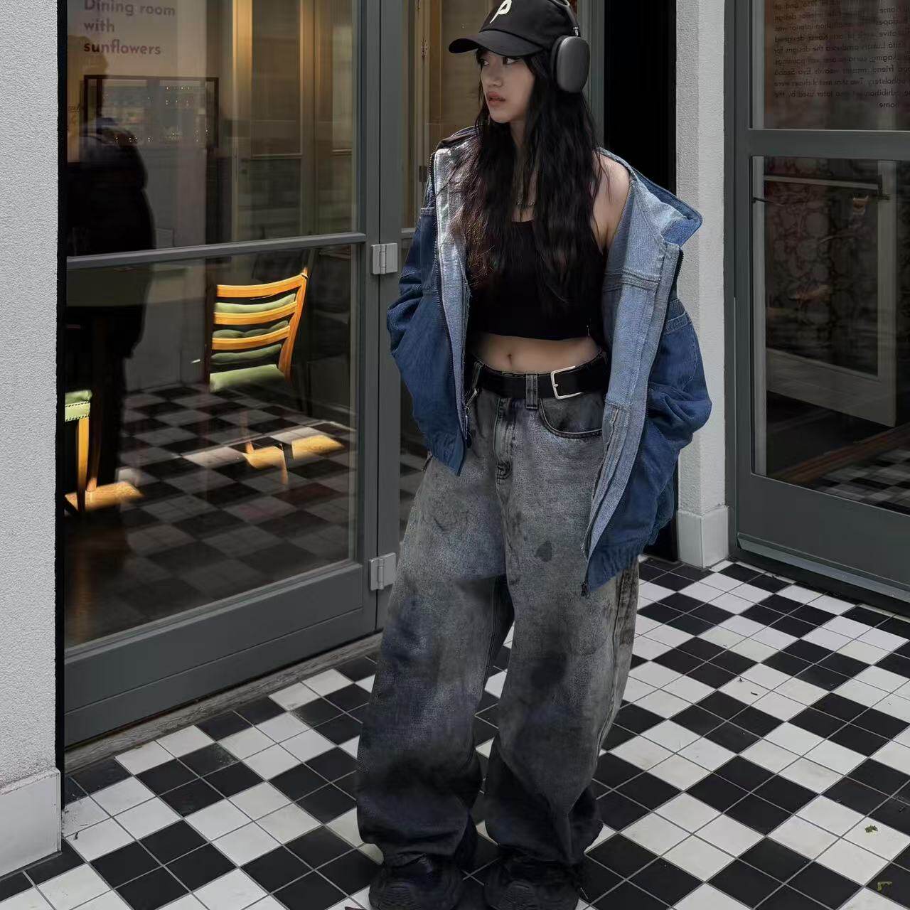 女潮牌宽松阔腿直筒休闲裤 复古水洗做旧泼墨牛仔裤 子 MODE美式 ICH