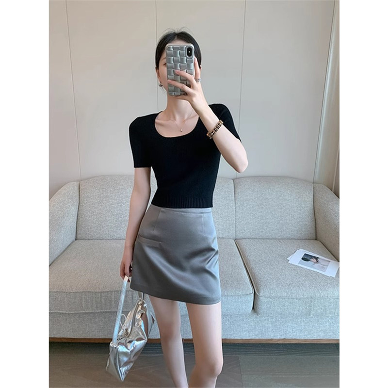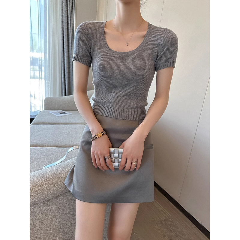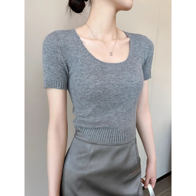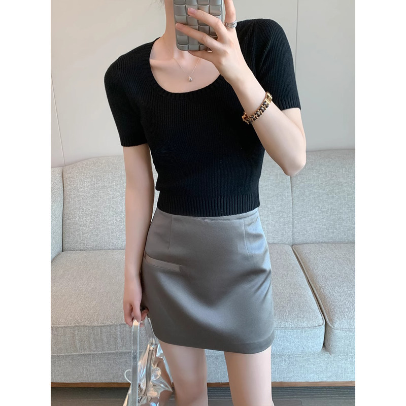 夏季 小个子冰丝针织衫 2025新款 短款 上衣 设计感修身 正肩t恤女短袖