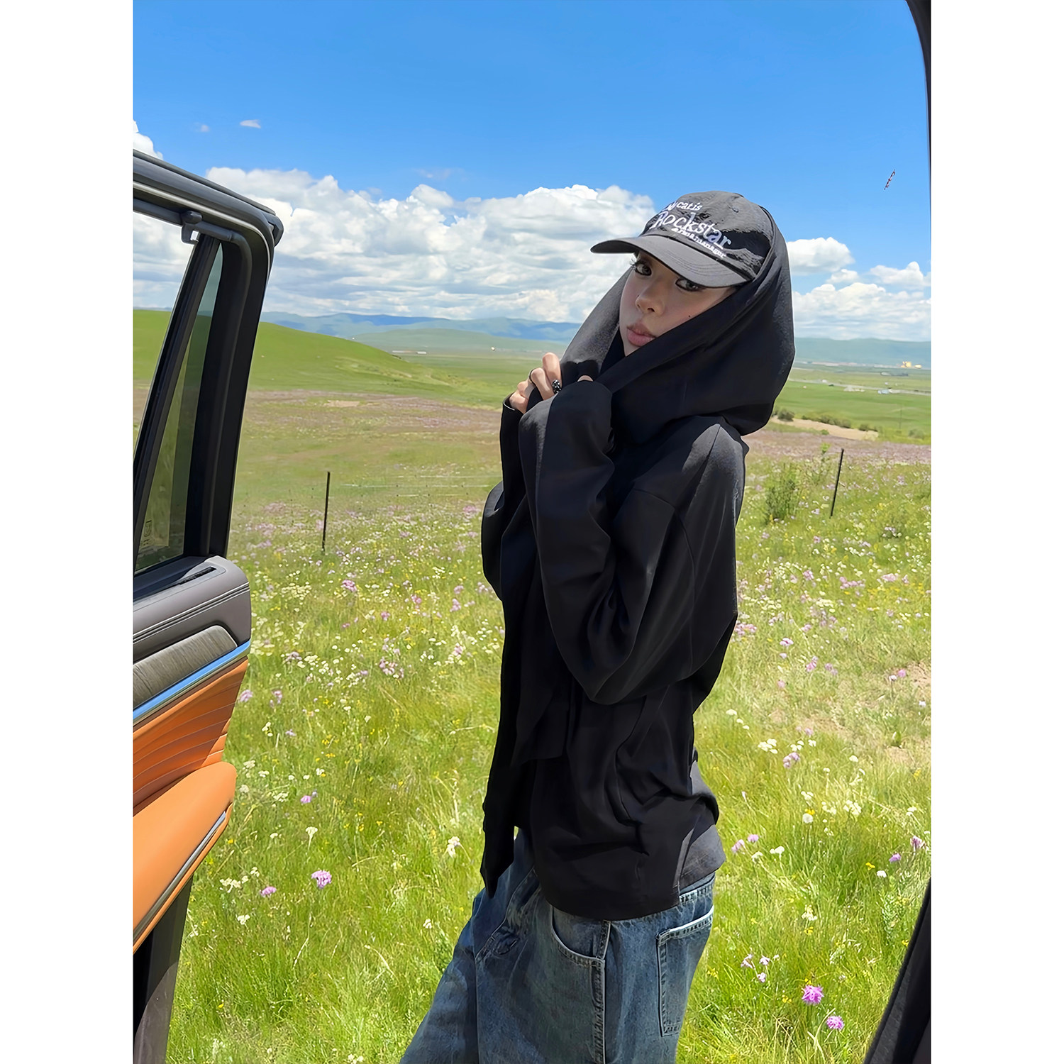 T恤披肩慵懒风宽松休闲上衣男女 复古围脖拼接亨利领长袖 F383 美式