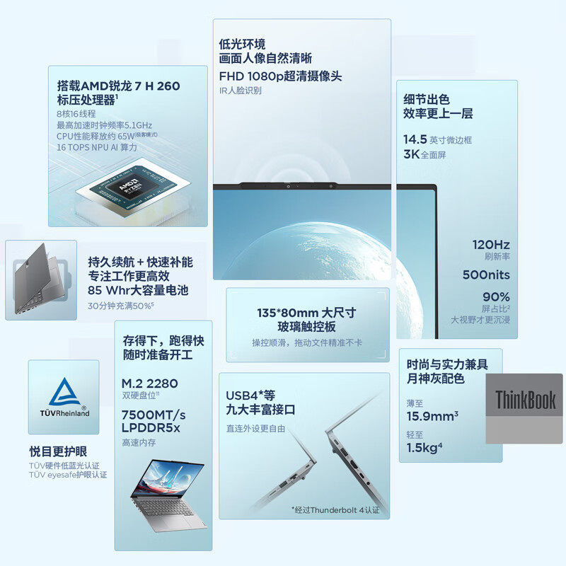 AI轻薄本锐龙AI7 2025 260 商务办公联想笔记本电脑88 ThinkPad 14.5英寸3K屏120Hz刷新率 ThinkBook14