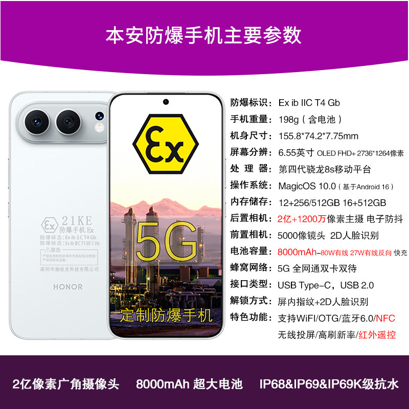 8000mAh大容量电池80W有线快充定制防爆化工厂石油库天然气制药业环境专用带防爆证书 荣耀500新款 honor 荣耀