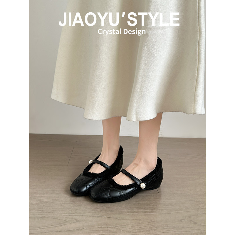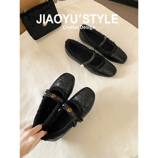 女新款 玛丽珍鞋 内增高4CM 方头平底水钻方扣浅口加绒单鞋 TFM