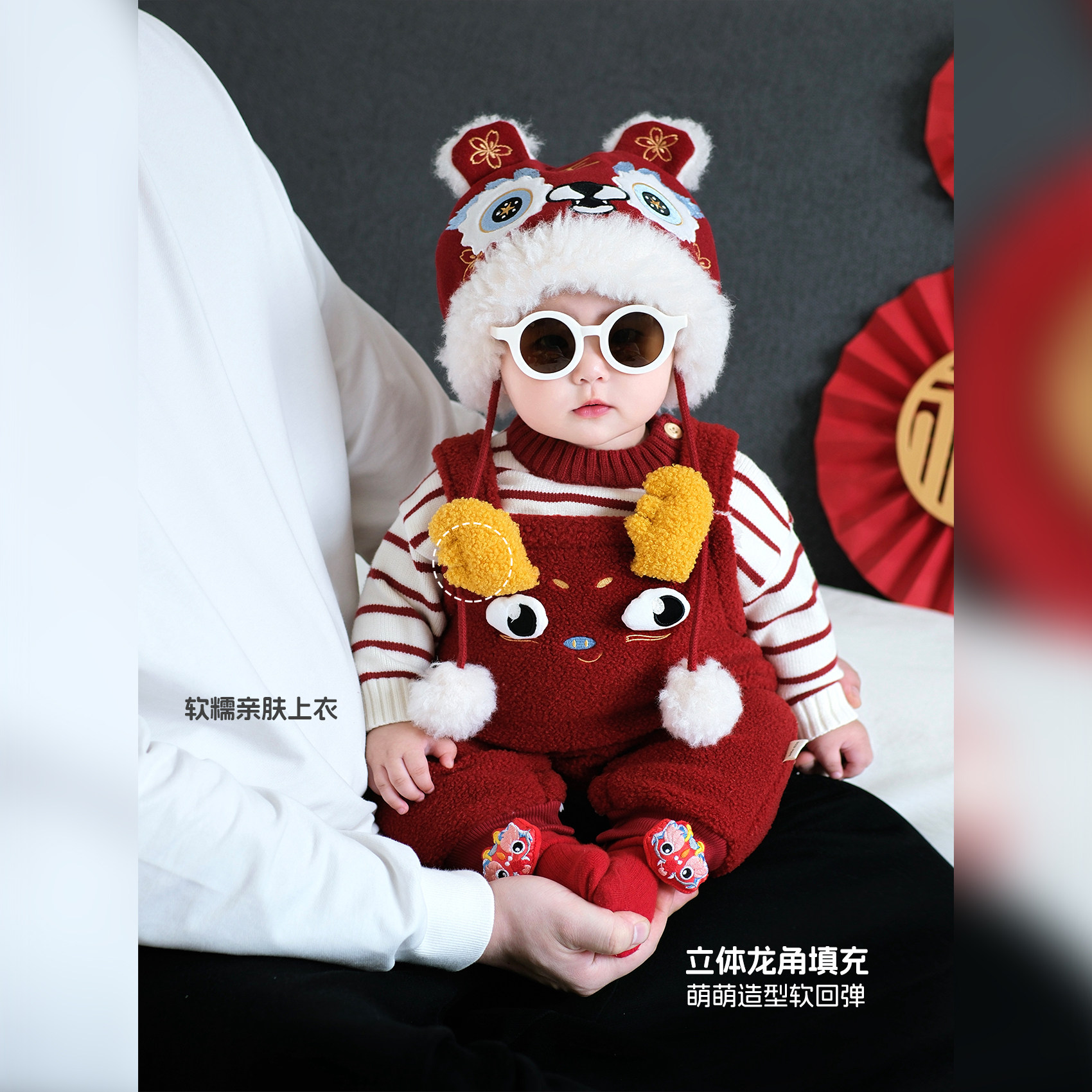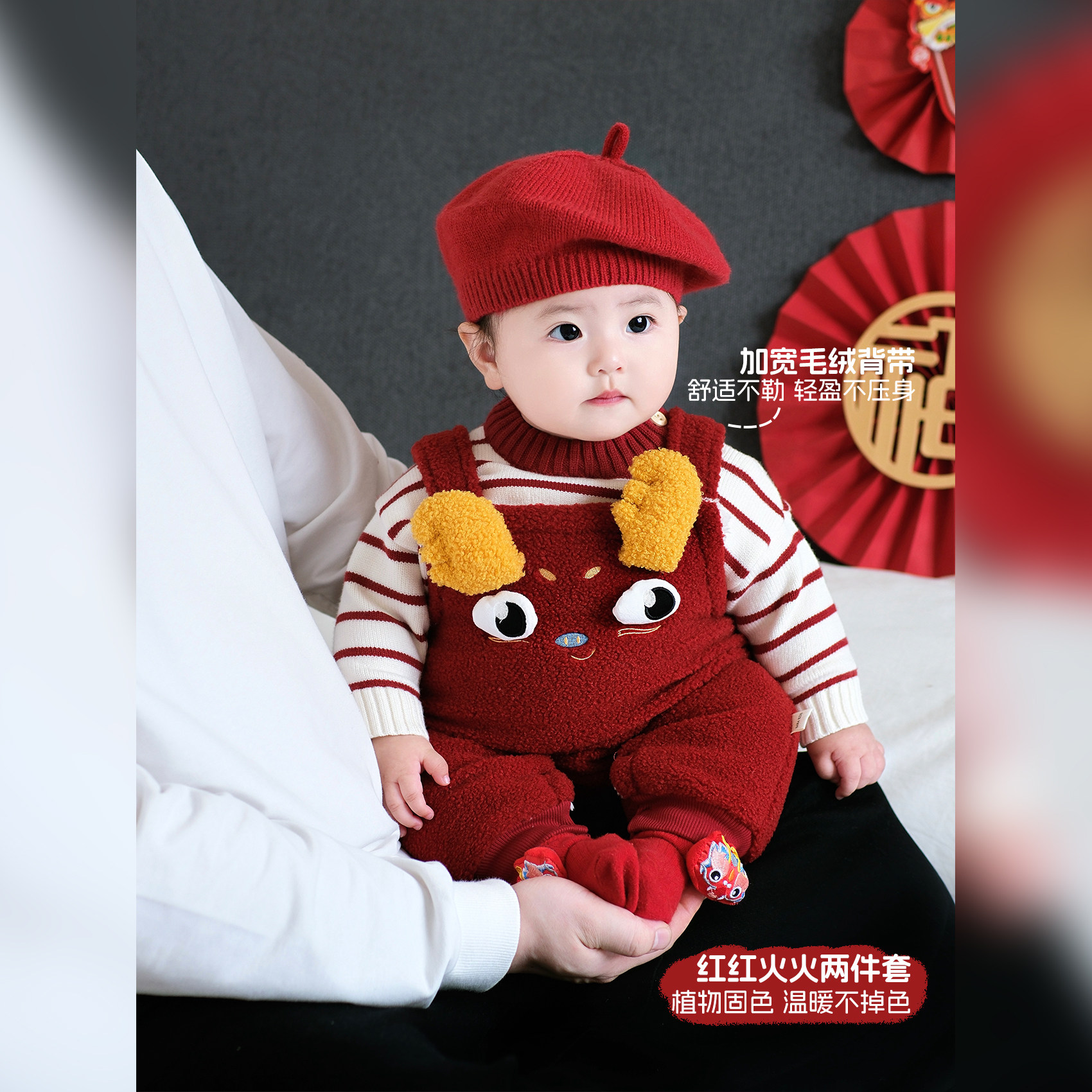 婴儿拜年服喜庆背带裤 小月龄宝宝新年过年衣服春节红色外出服 套装