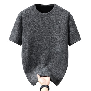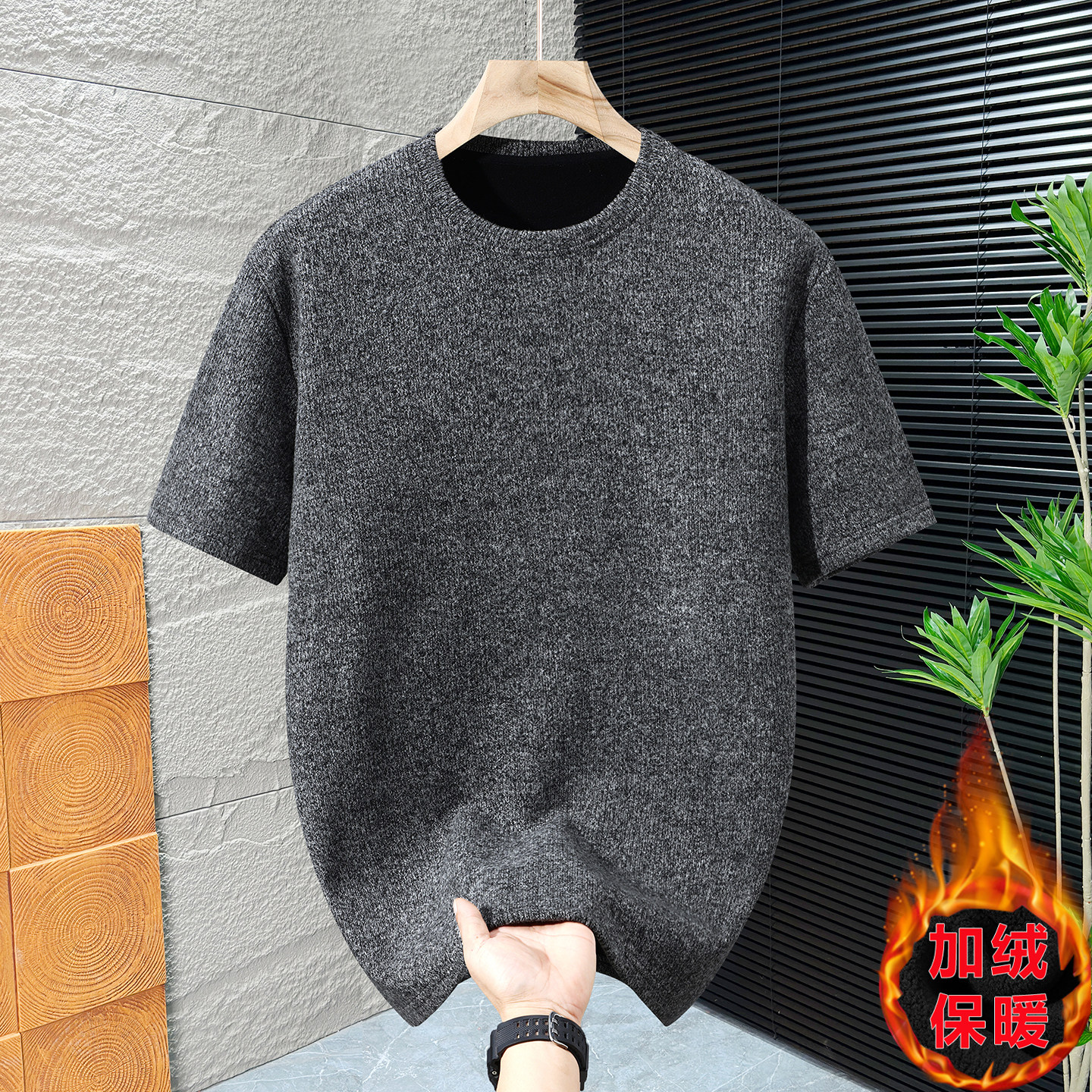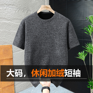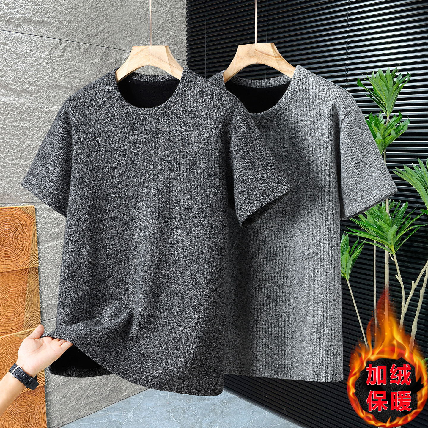 冬季 宽松打底衫 保暖短袖 加肥加大码 纯色 T恤男加绒加厚半袖 男士