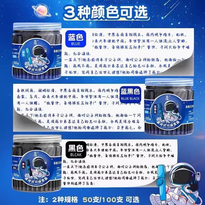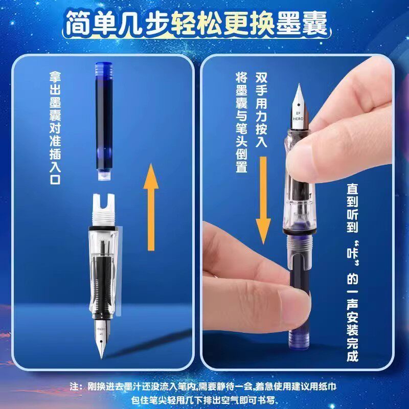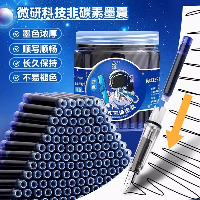 616透明钢笔通用3.4mm口径非碳素蓝黑色不堵笔钢笔墨胆 359 英雄牌墨囊钢笔小学生专用袋装 黑色蓝色色原装