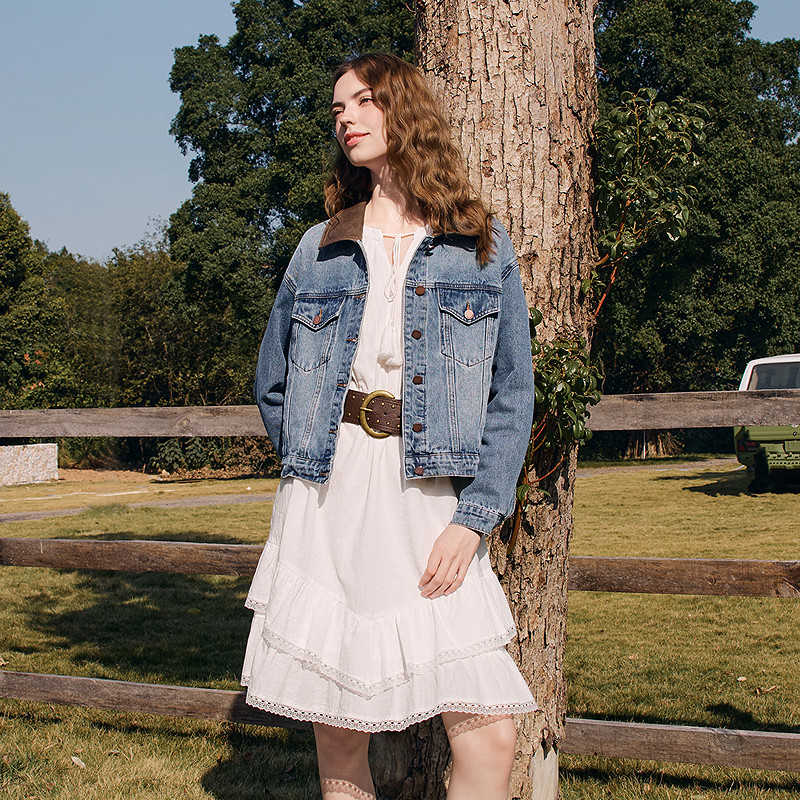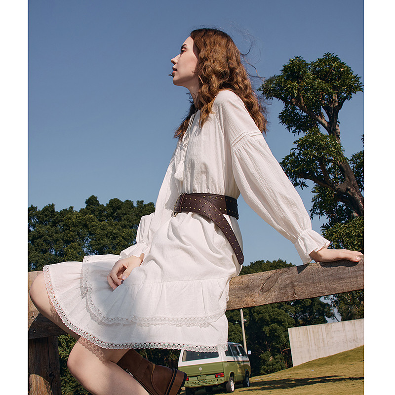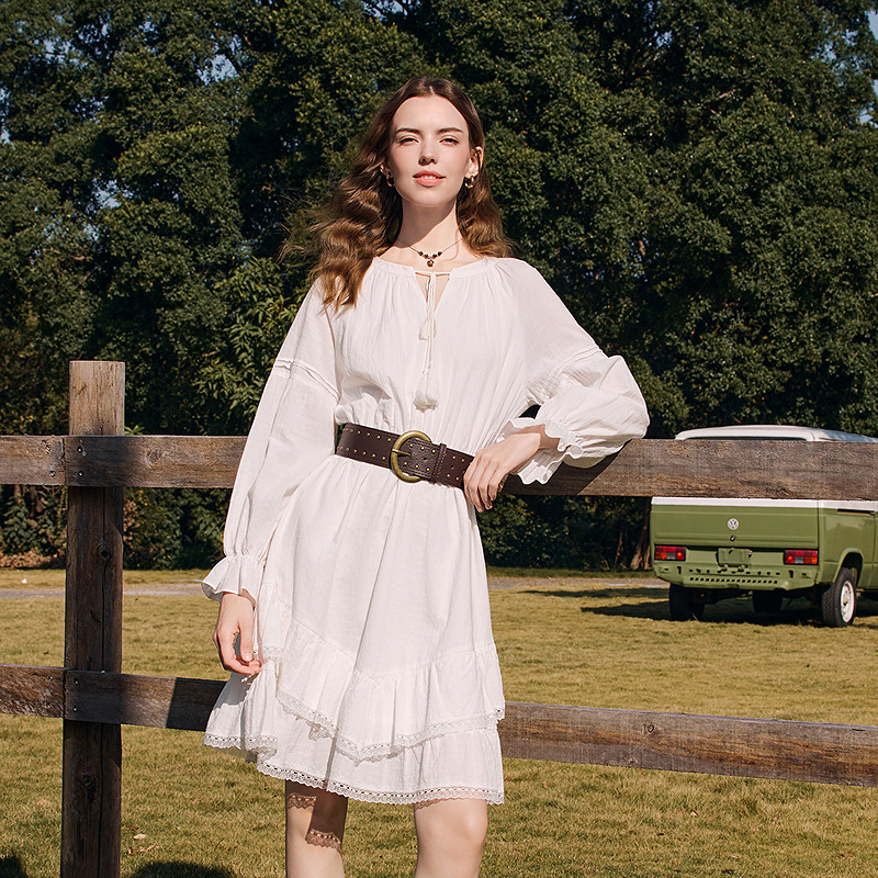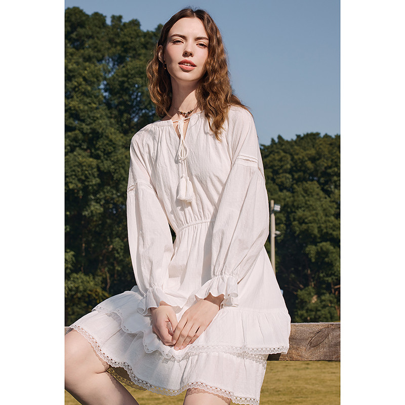 新款 蕾丝荷叶边连衣裙女2026年春季 百图法式 白色气质收腰裙 新品