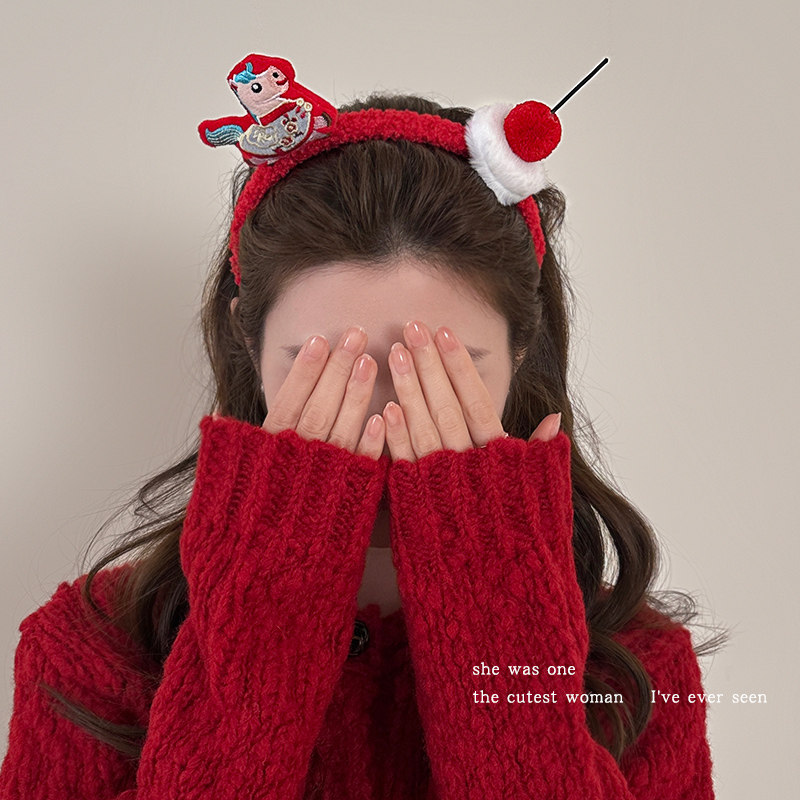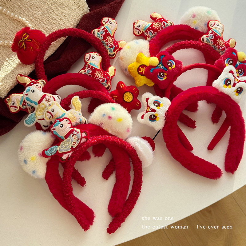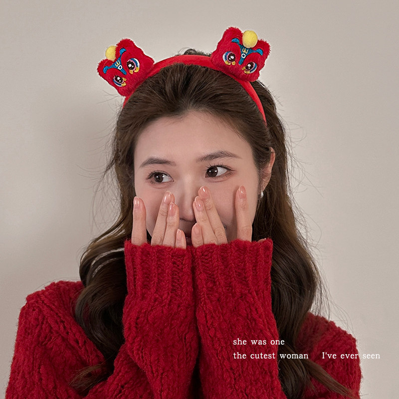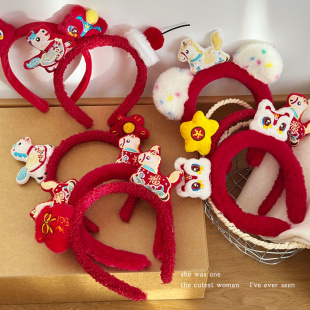 新年毛绒醒狮发箍女红色小马头箍跨年装 扮发卡头饰喜庆过年发饰品
