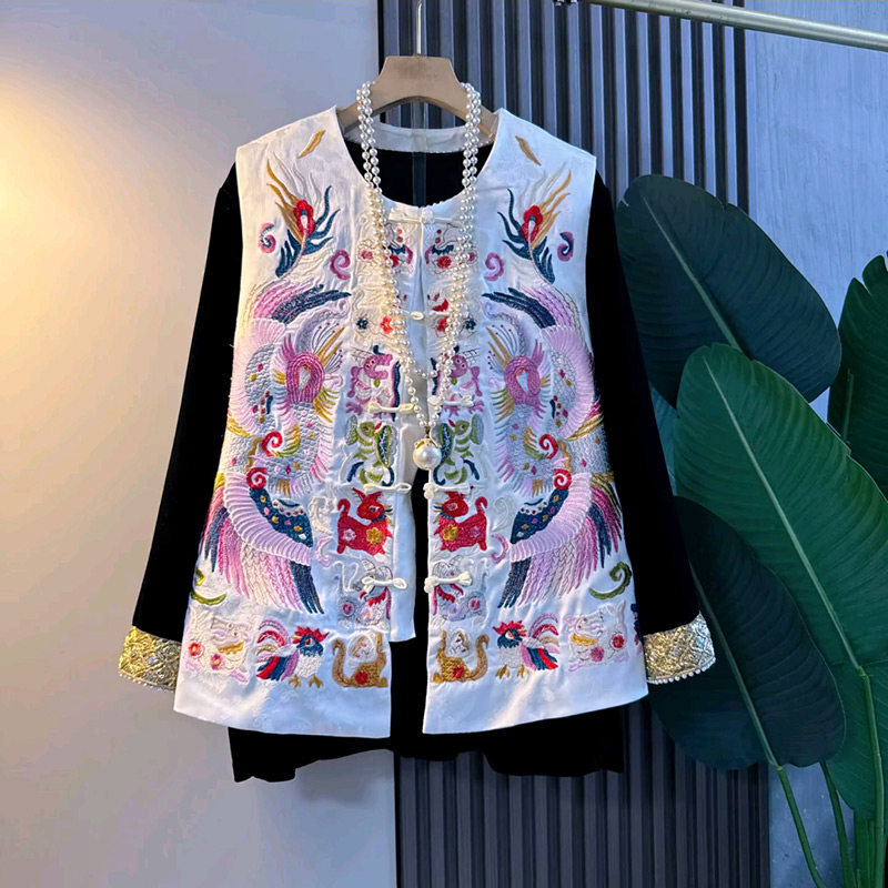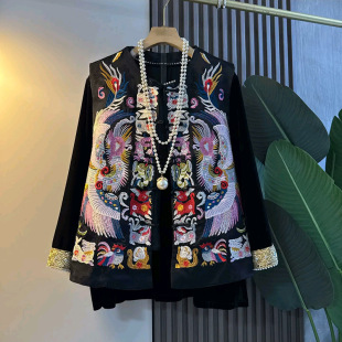 女装 胖妹妹大码 潮 打底衫 轻奢民族风复古凤凰十二生肖刺绣马甲拼袖