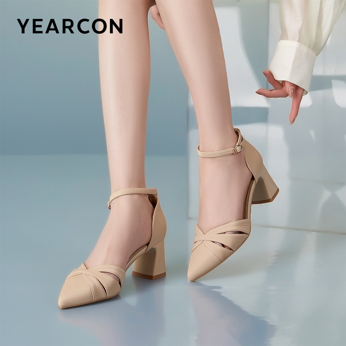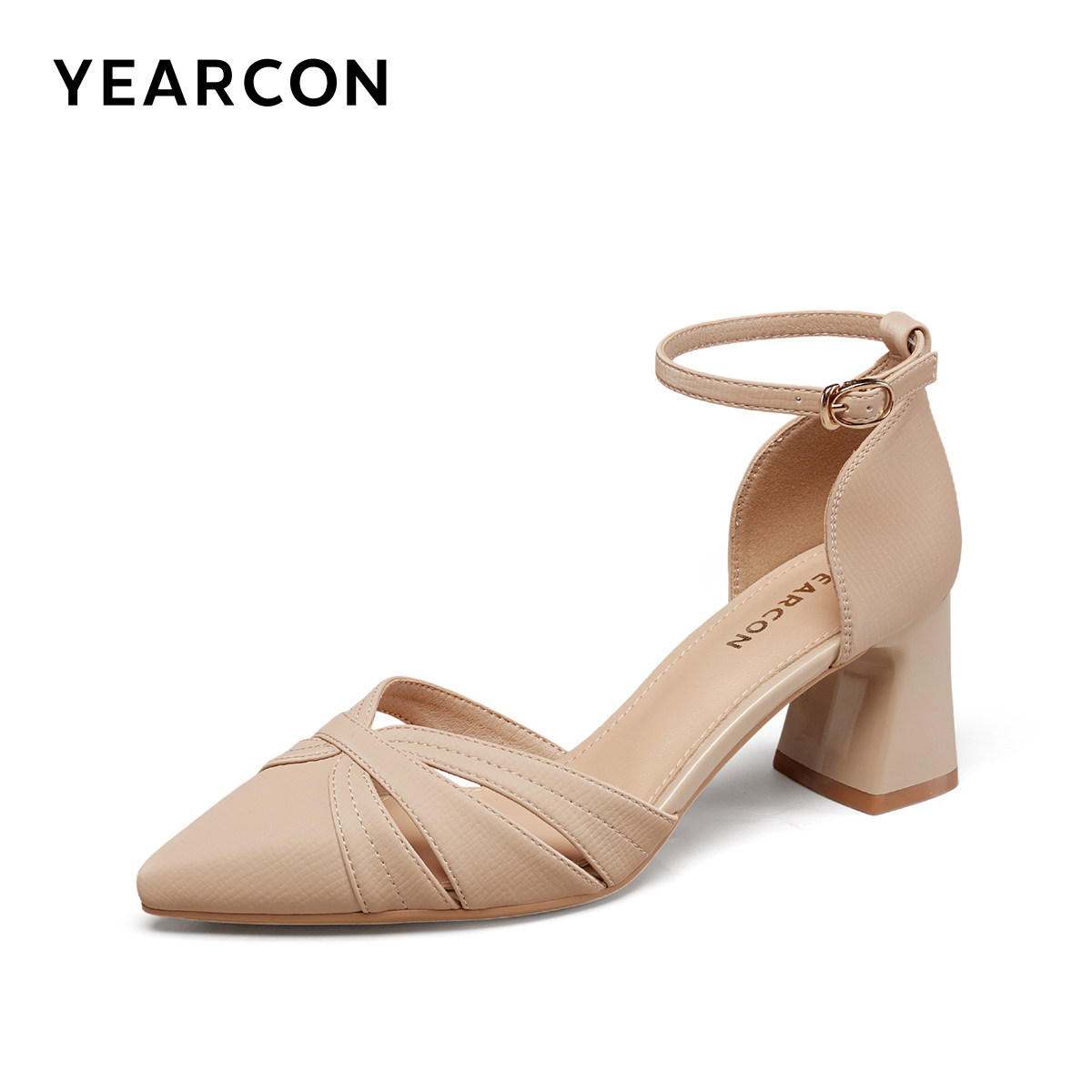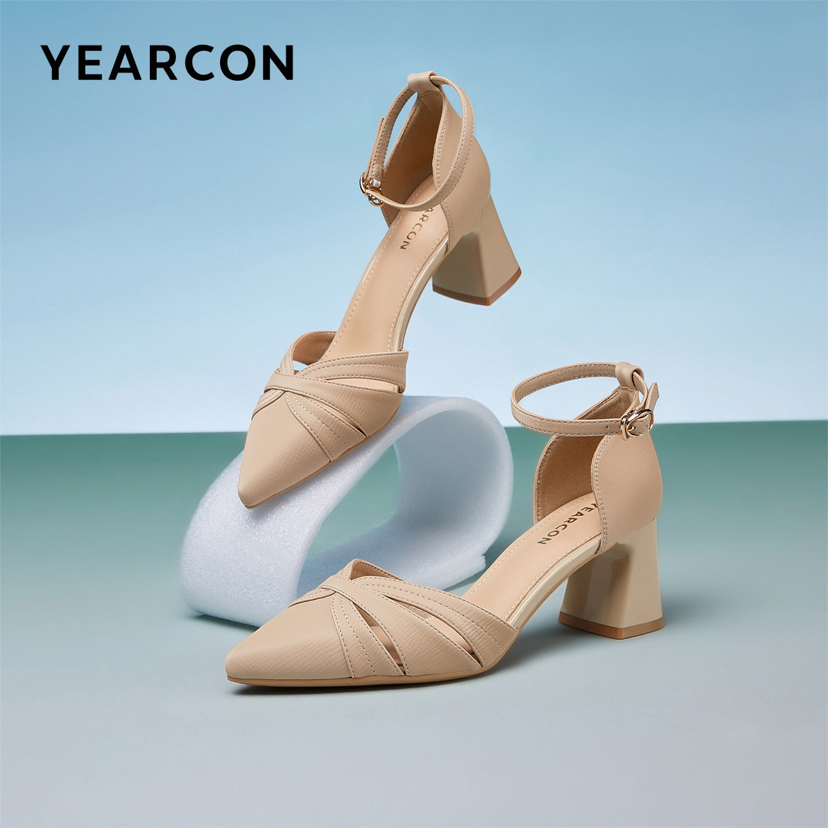 法式 粗跟女士尖头高跟包头凉鞋 外穿配裙子一字扣带 夏季 意尔康女鞋