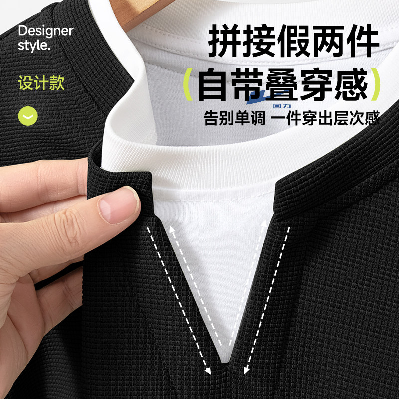 绿色休闲内搭亲肤重磅假两件V领打底衫 回力华夫格长袖 t恤男春季