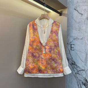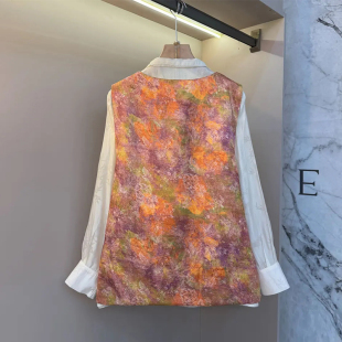 胖妹妹韩版 加肥大码 小衫 翻领长袖 气质设计感V领花朵国风马甲 女装
