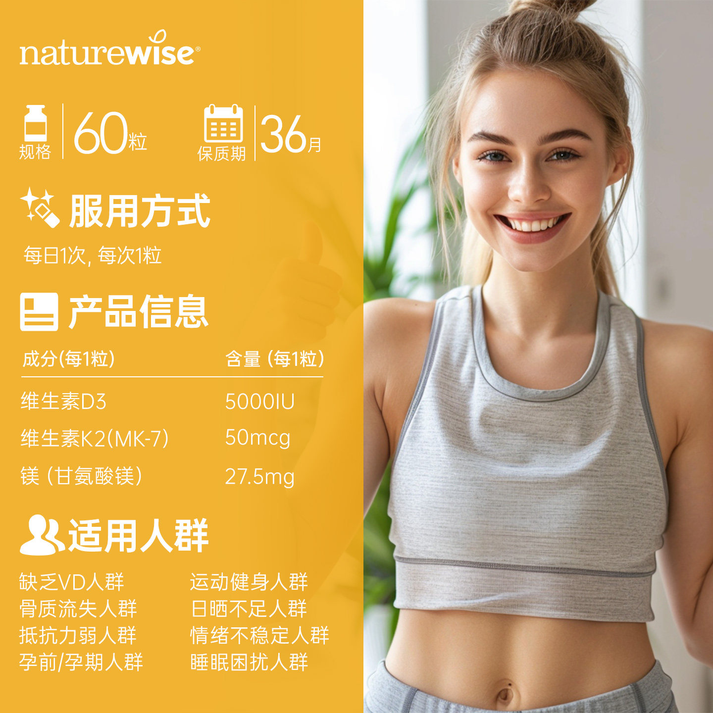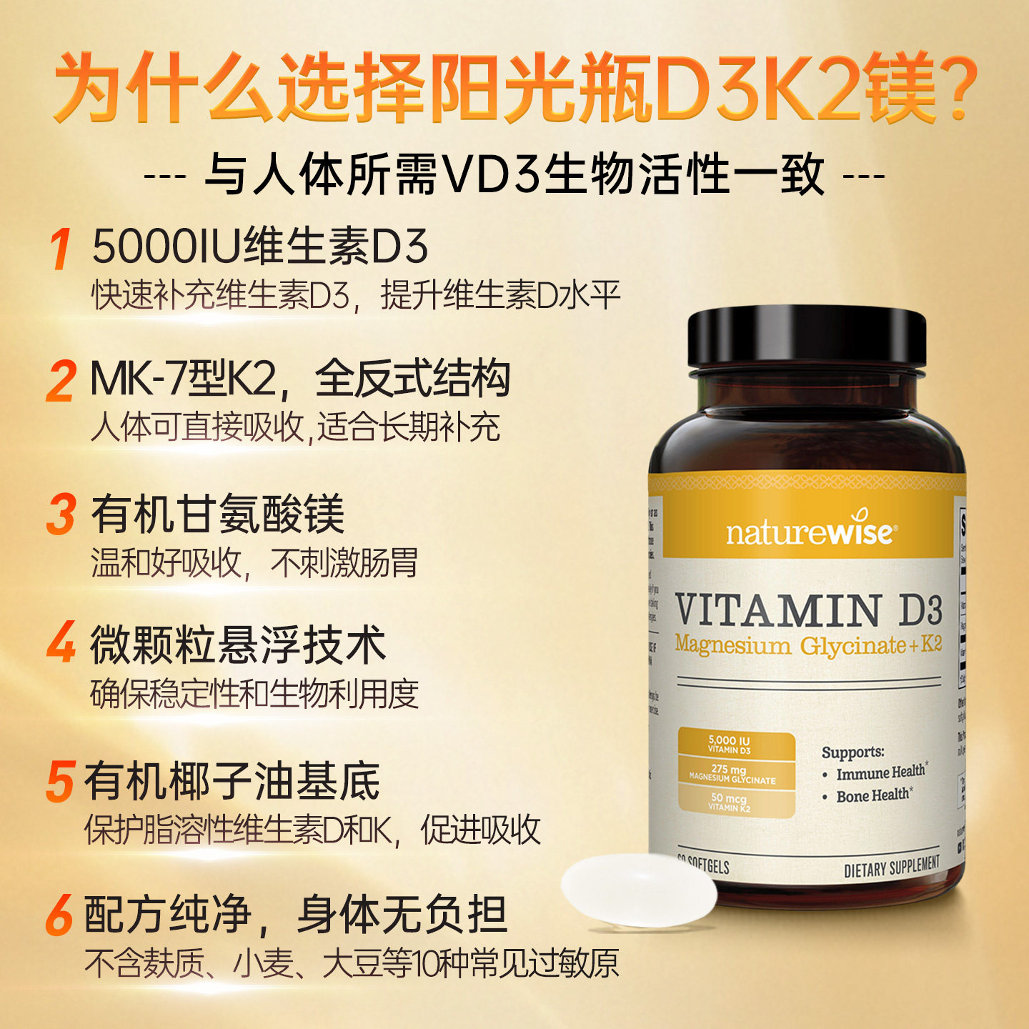 Naturewise阳光瓶维生素d3活性维生素d5000iu备孕维d3k2镁三合一