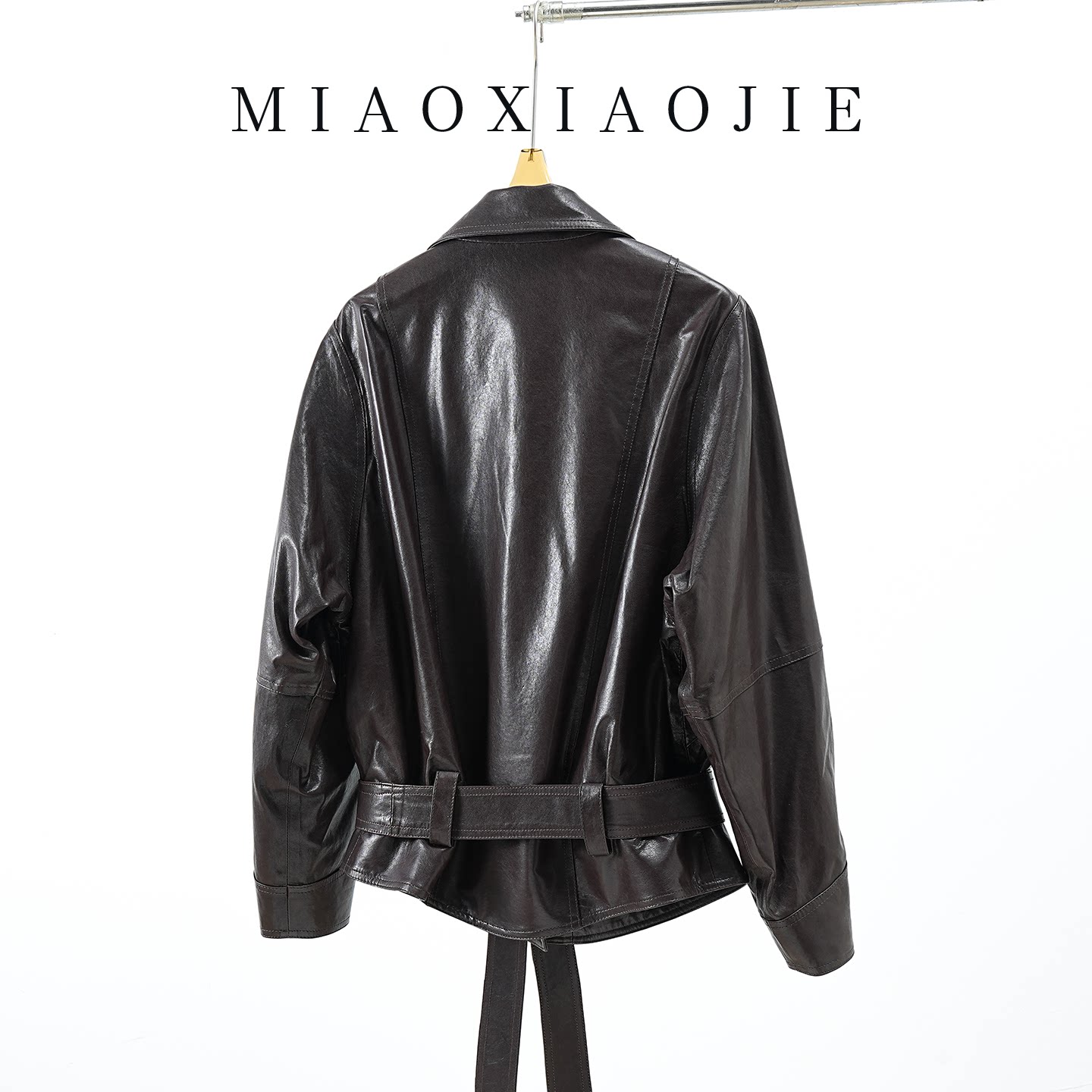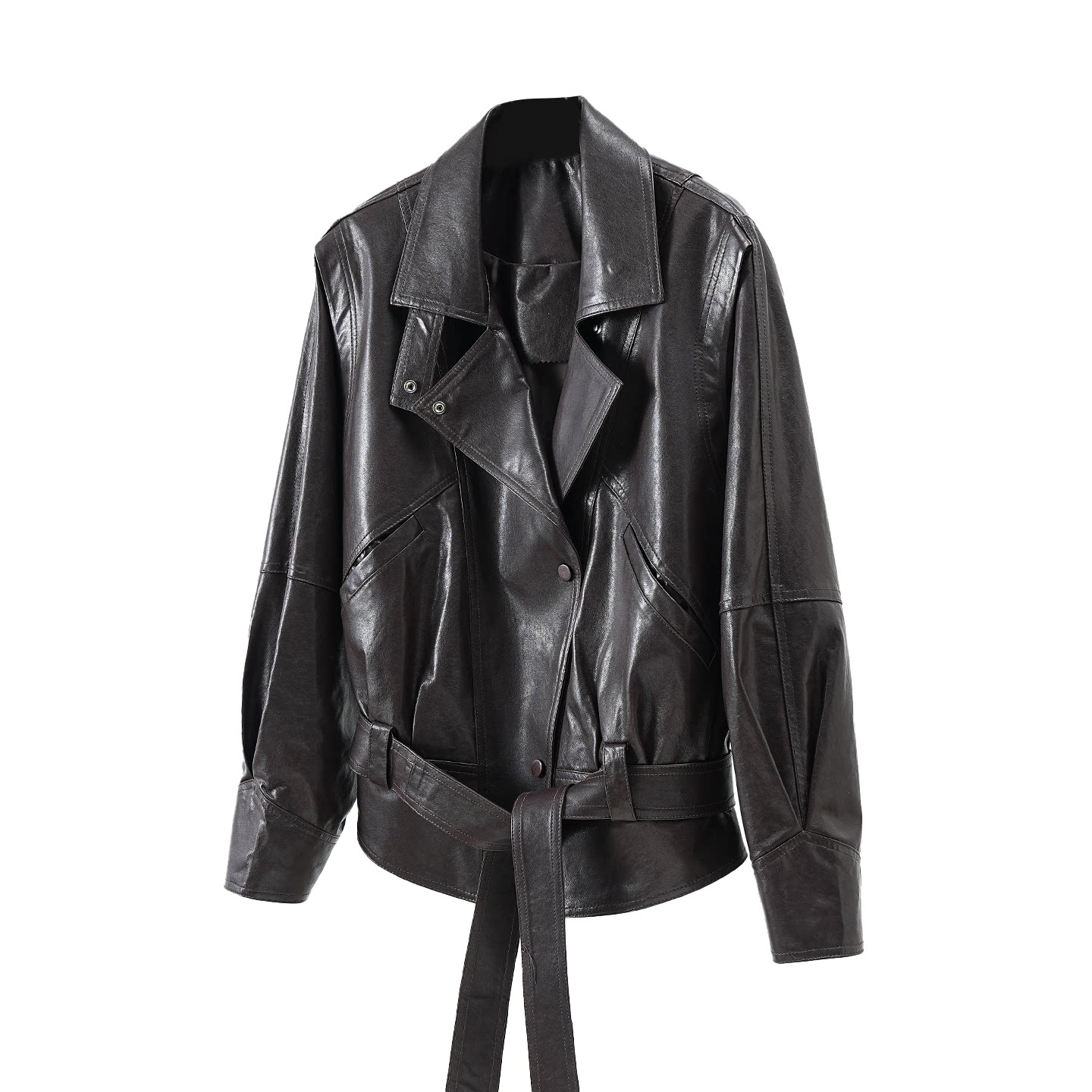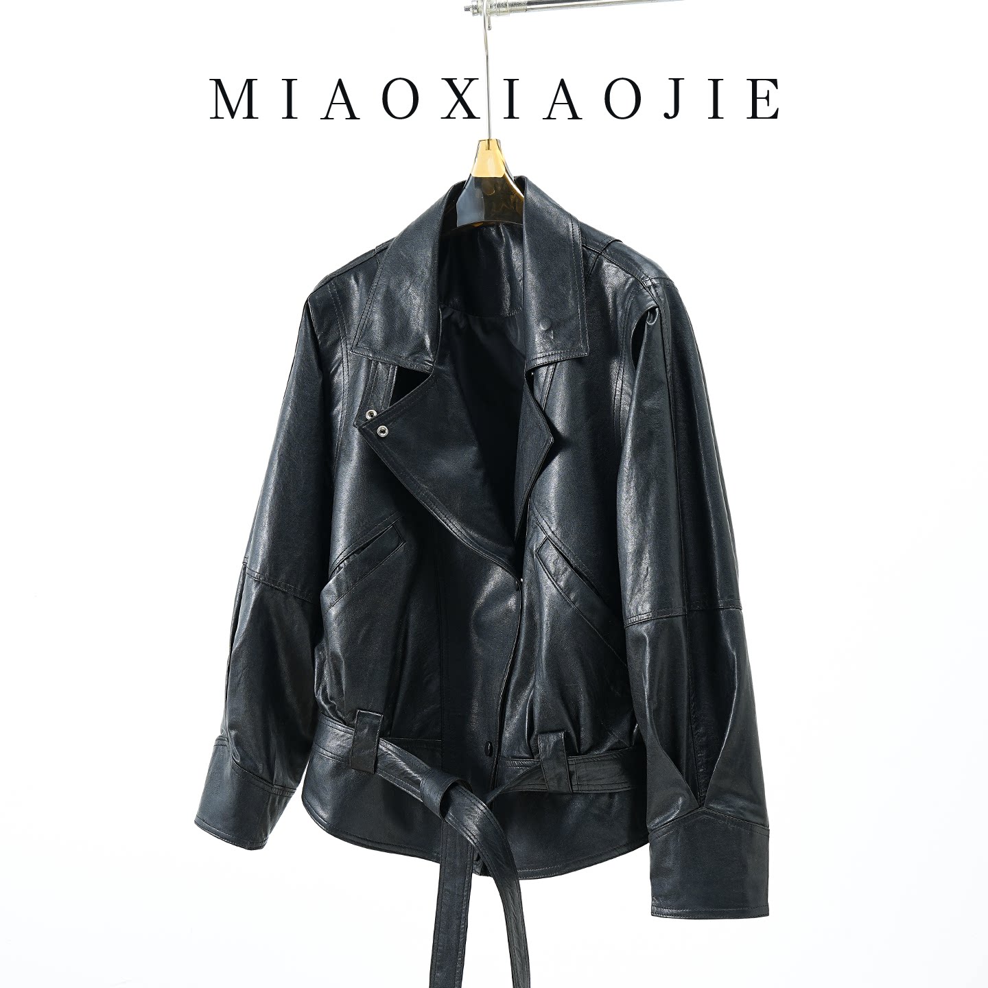 复古酷飒风翻领小羊皮真皮皮衣外套女春秋美式 宽松机车皮夹克 短款