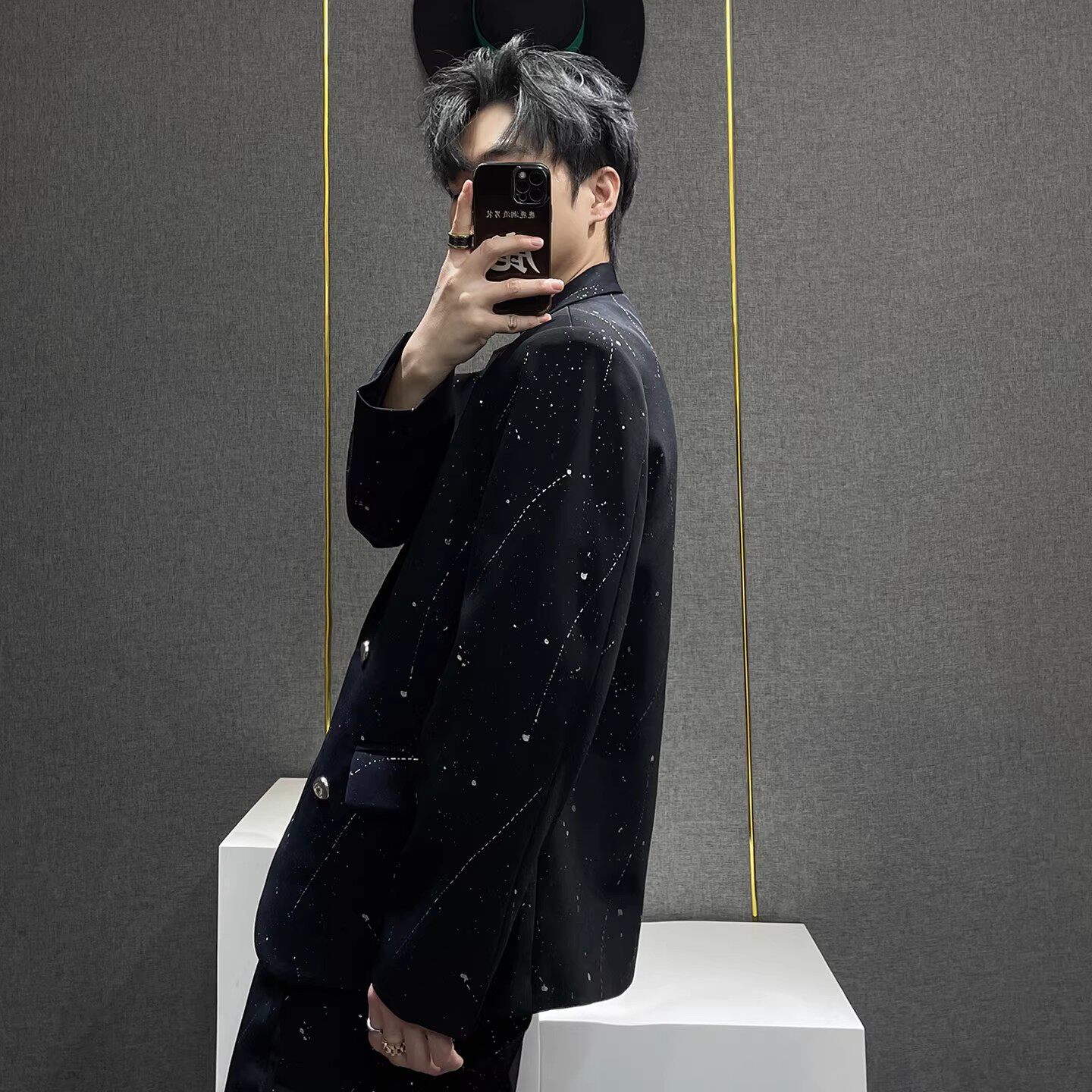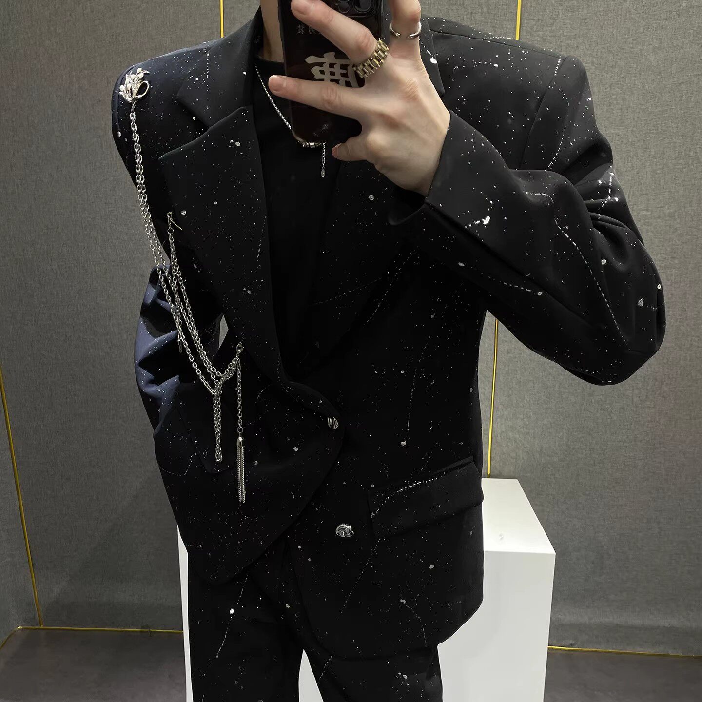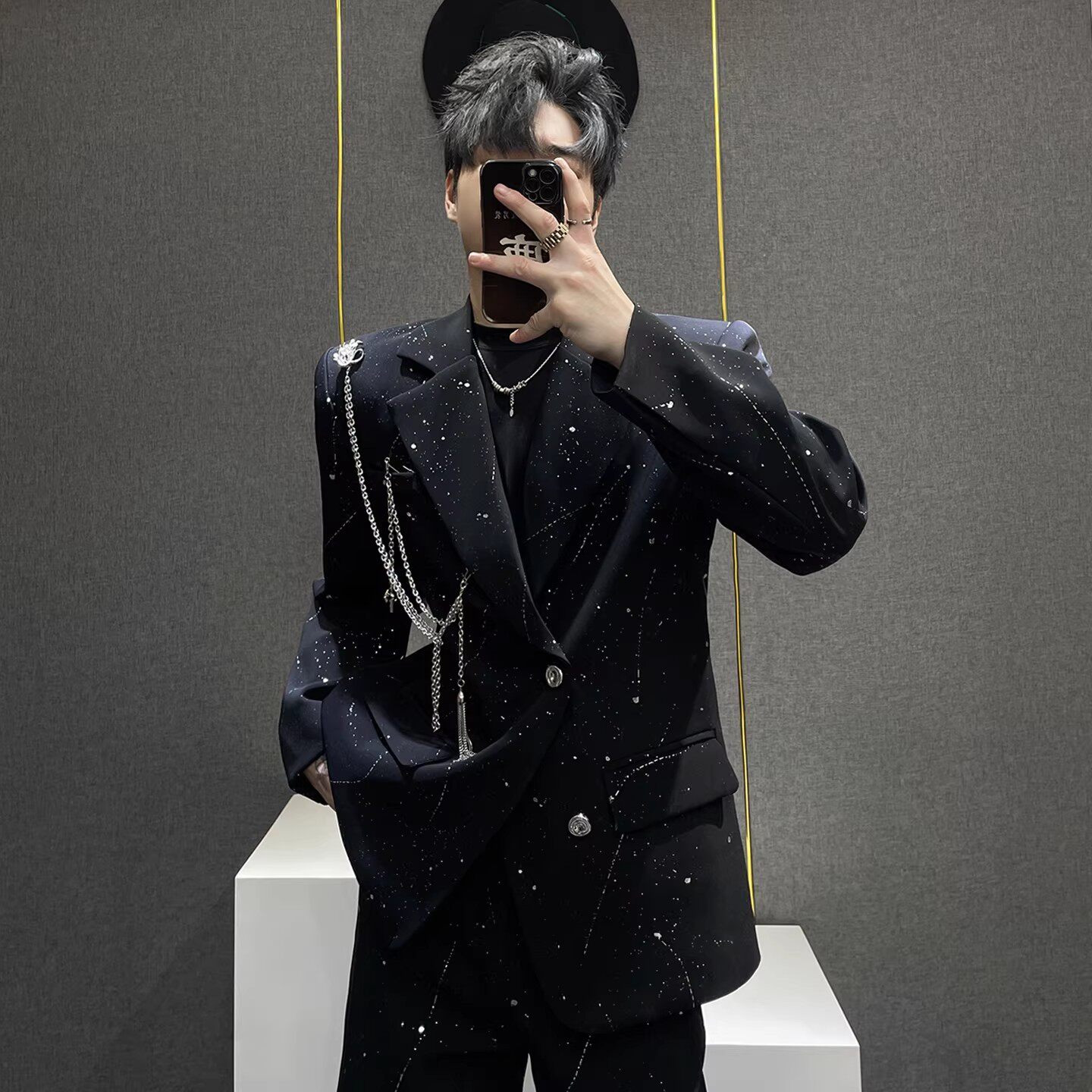 黑色设计感链条满天星西服套装 外套 男高级感痞帅演出宽松垫肩西装