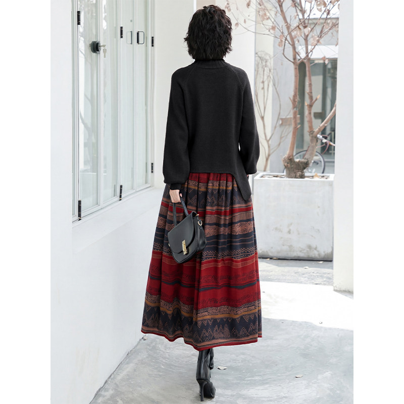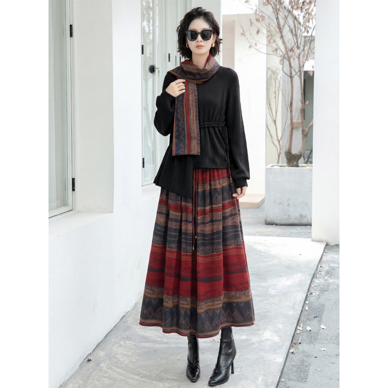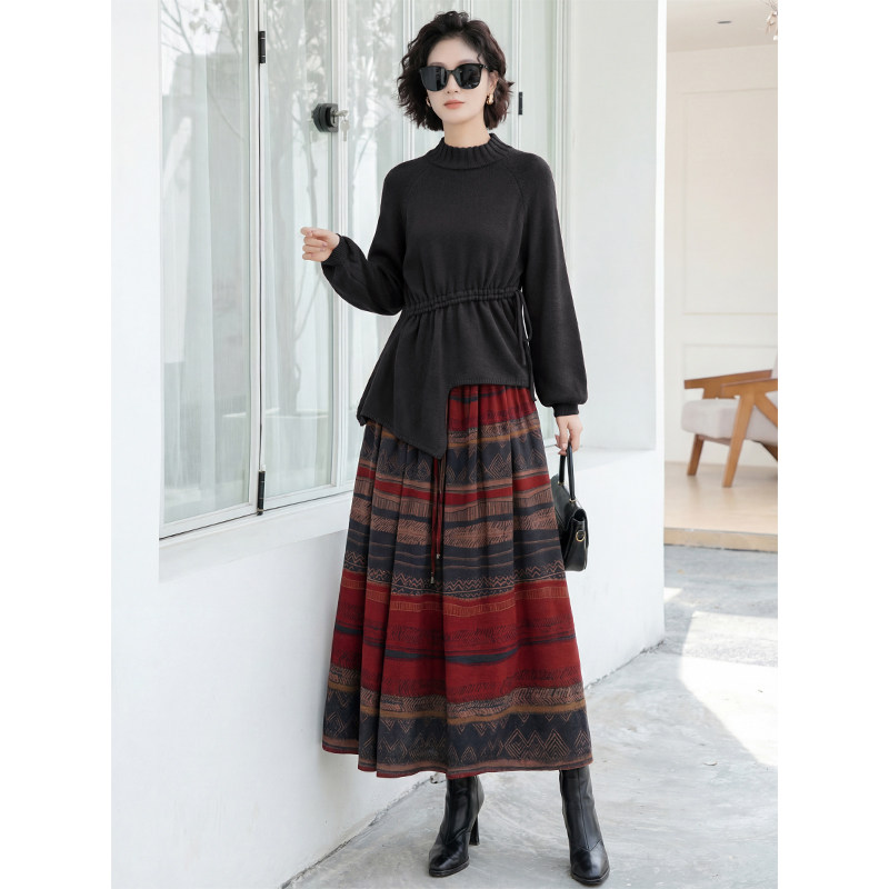 黑色民族风复古套装 女2026春秋系带针织毛衣波西米亚半身裙两件套