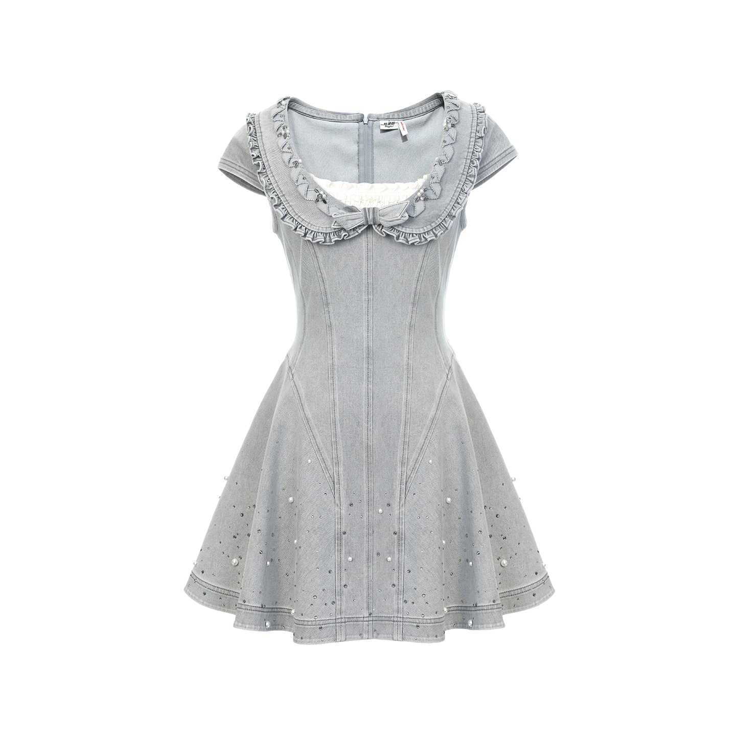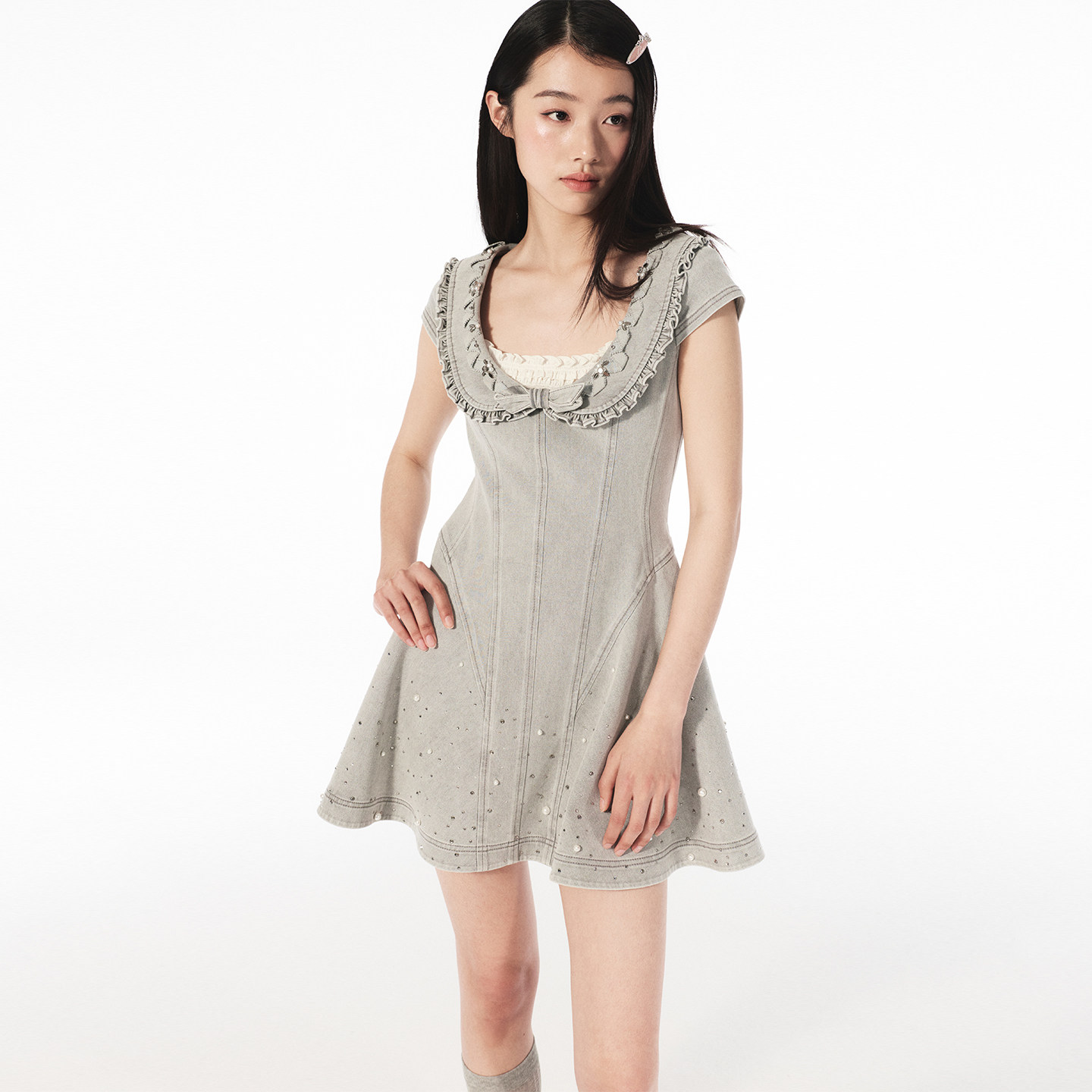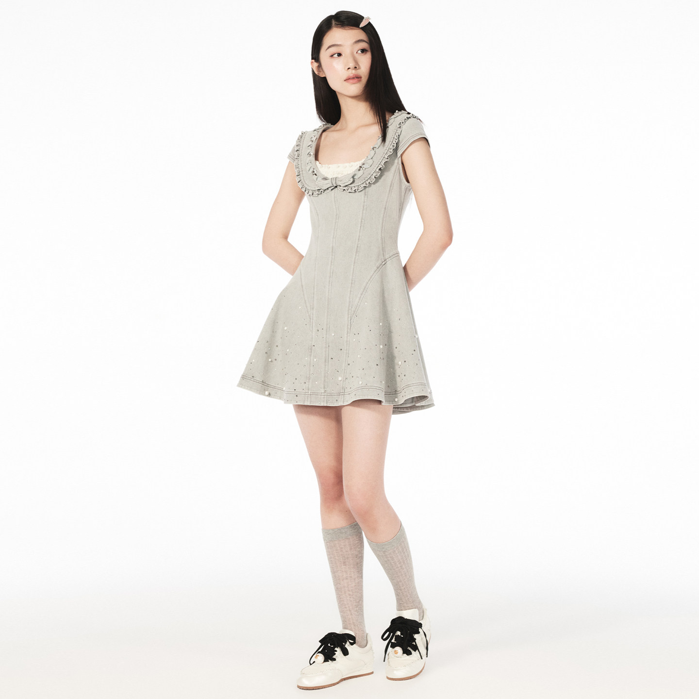荷叶边A摆牛仔连衣裙烫钻设计短裙 时尚 lefame拉飞姆2026夏季 新款