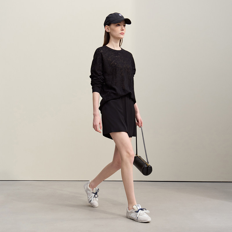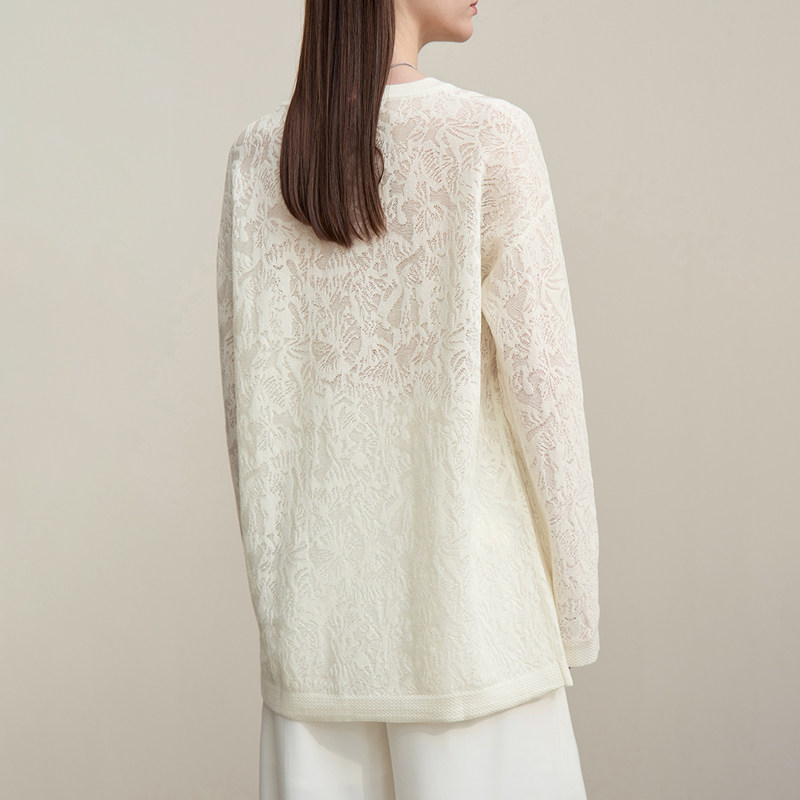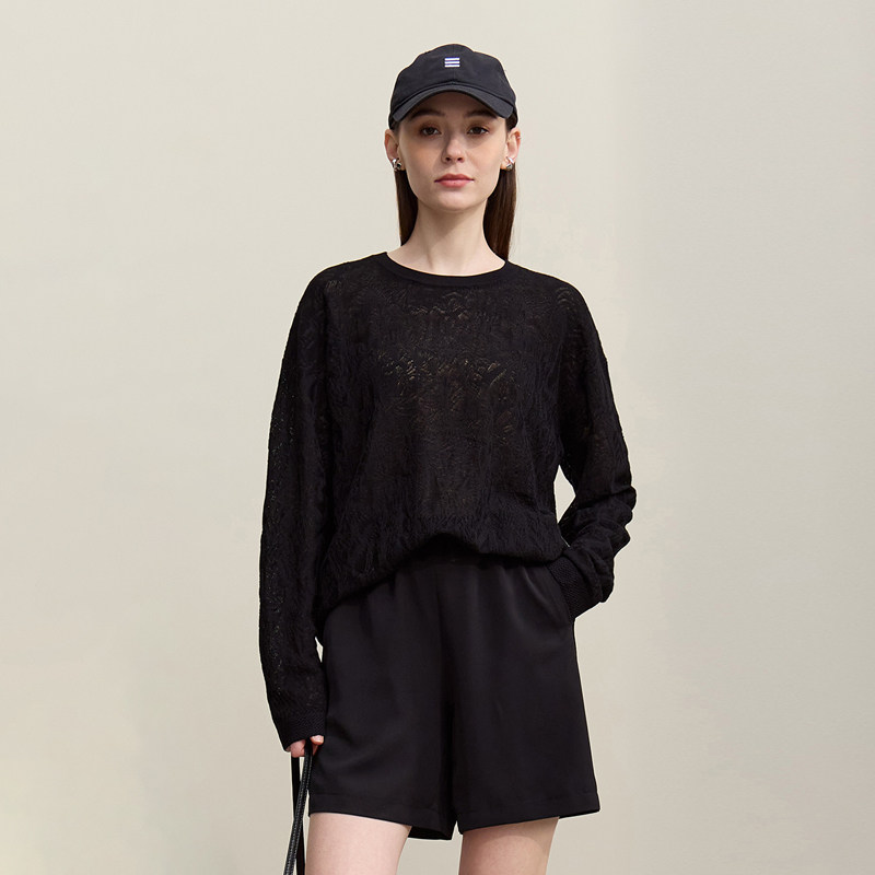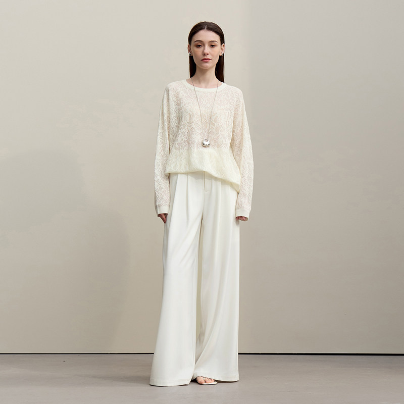 Amii2026春新款 女宽松落肩上衣 高捻莱赛尔欧根纱圆领提花毛针织衫