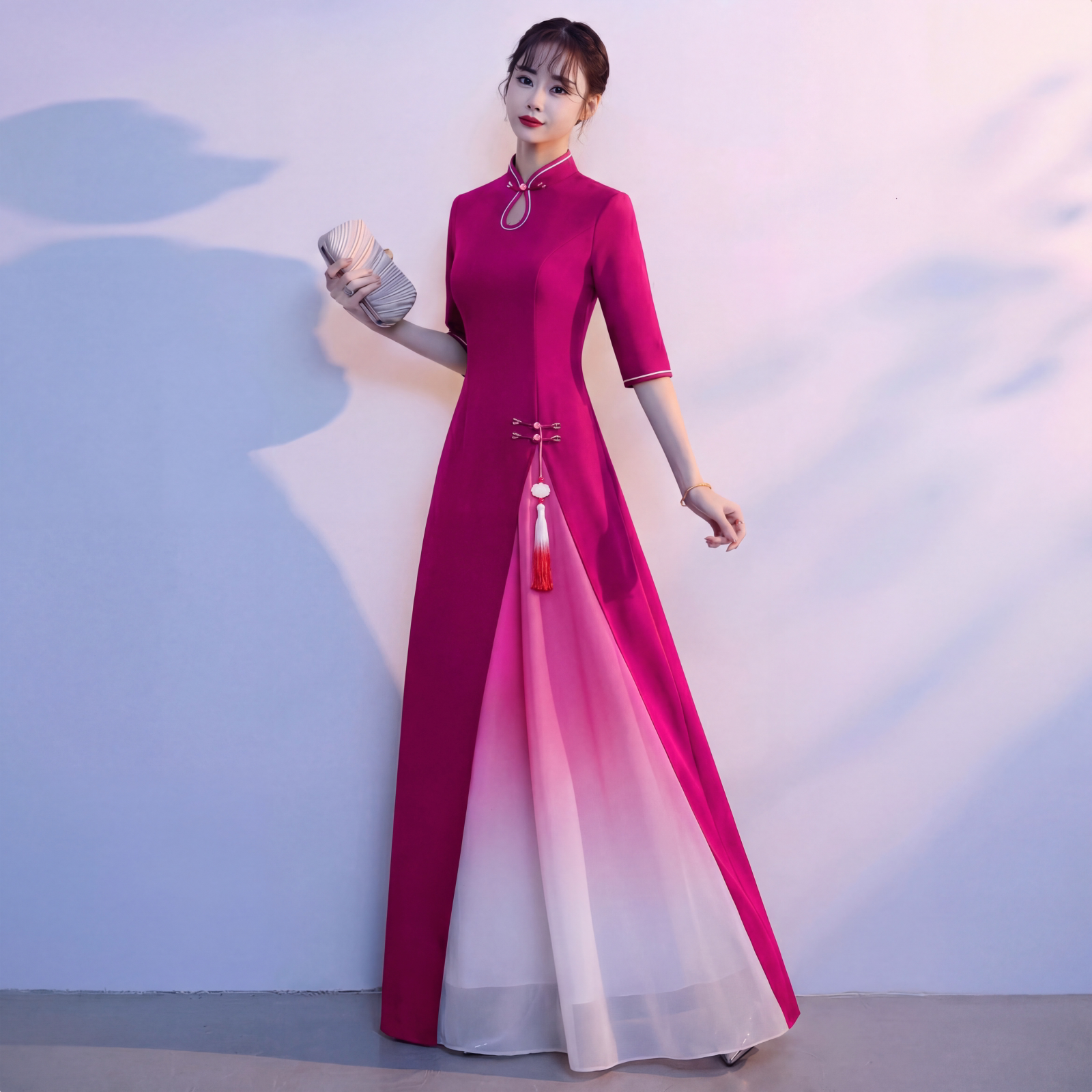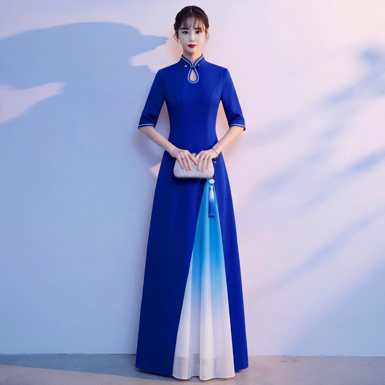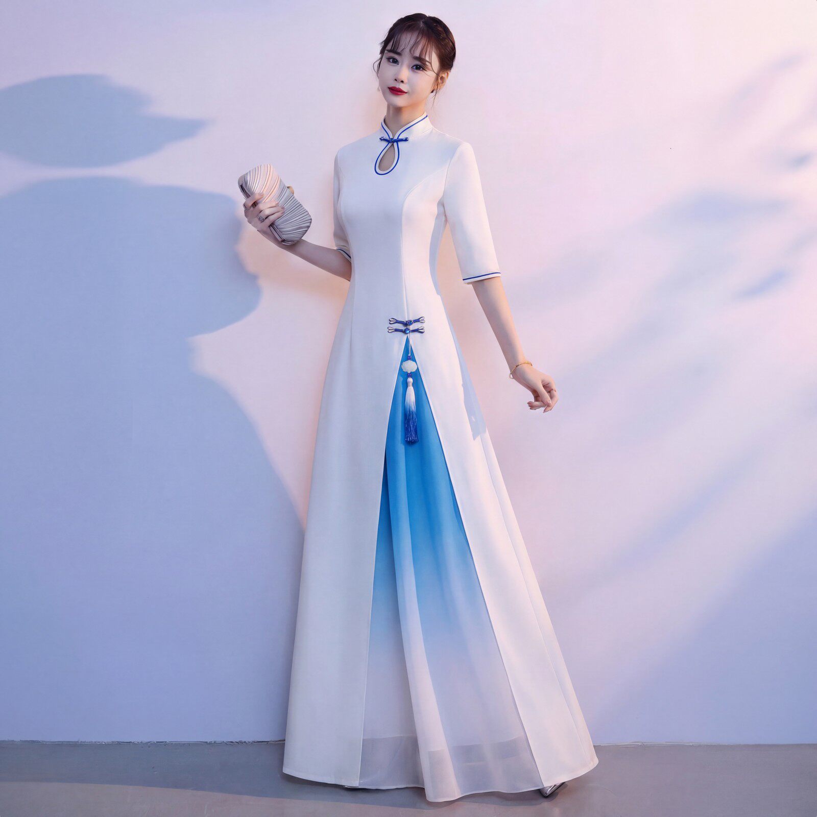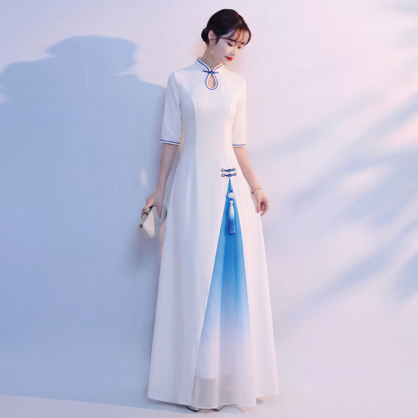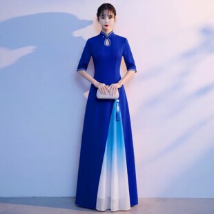 修身 旗袍女长裙立领盘扣演出服中式 舞台表演晚礼服 渐变色短袖 新款