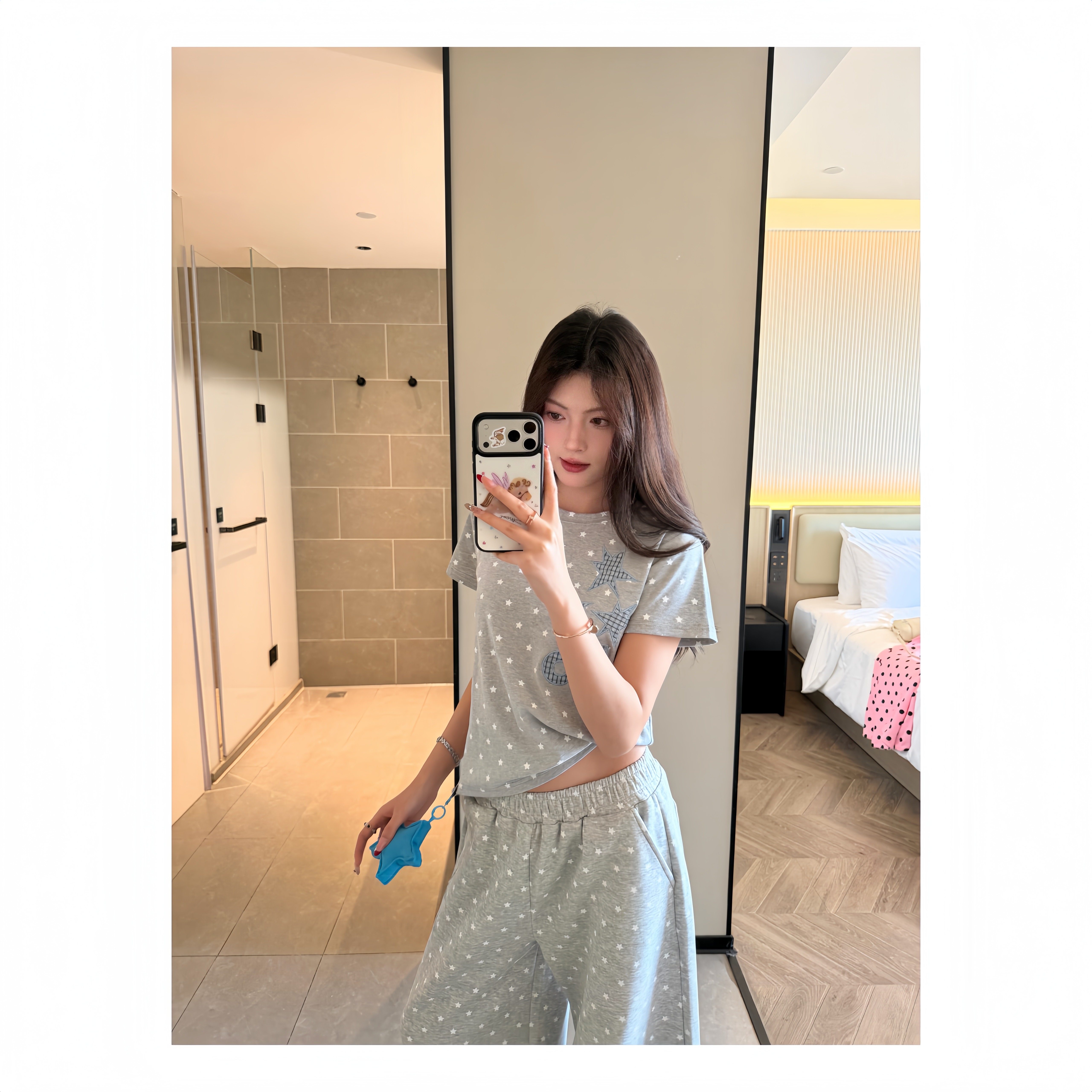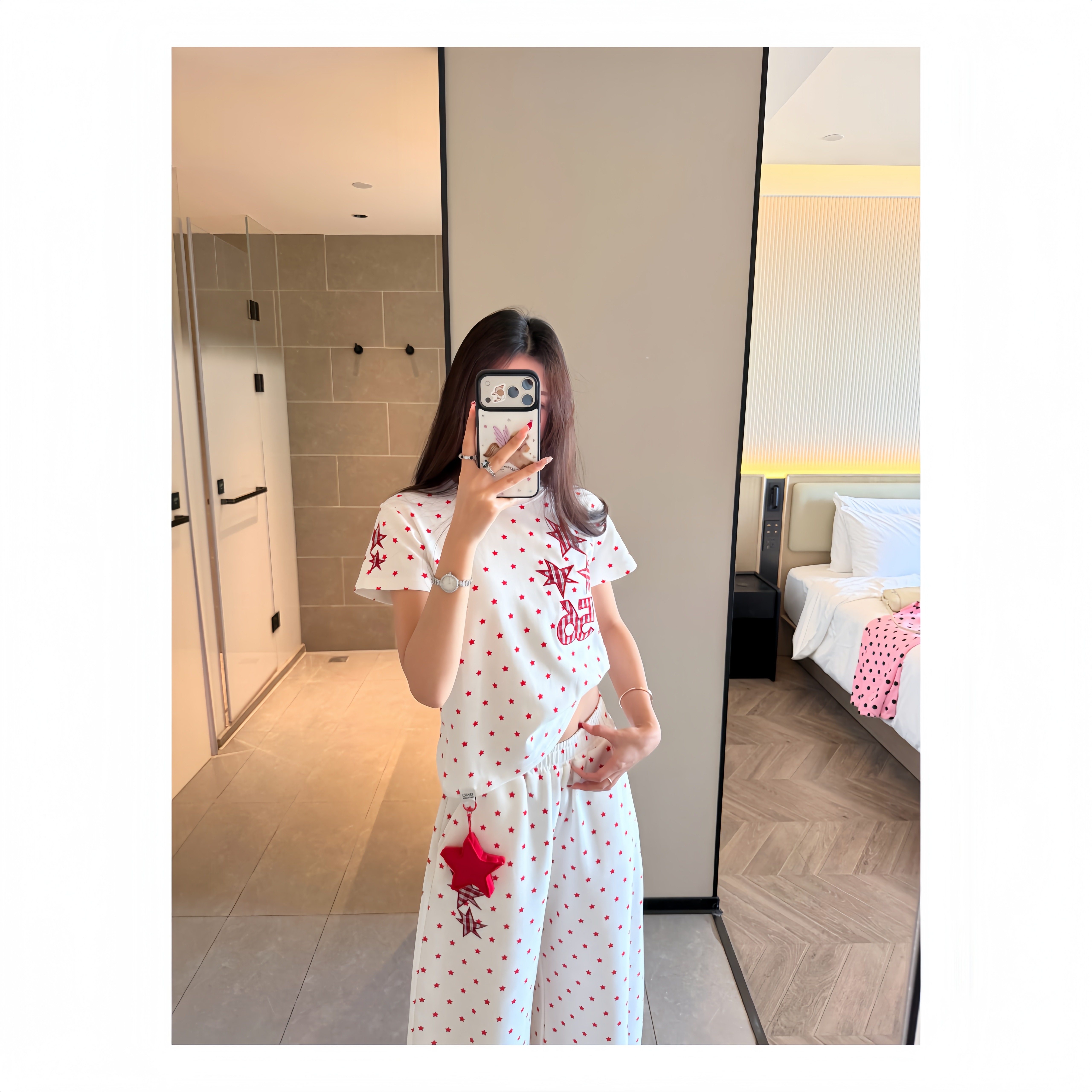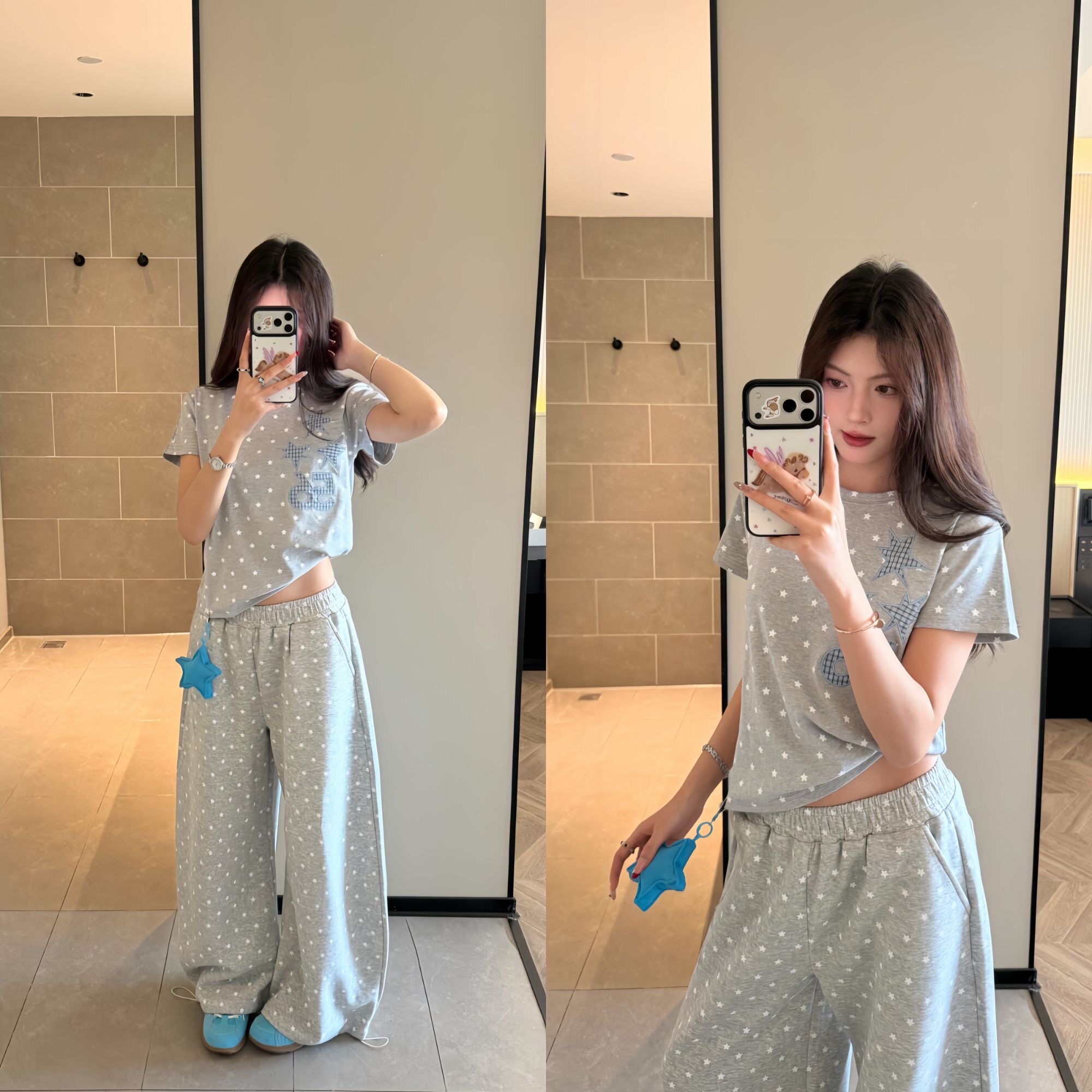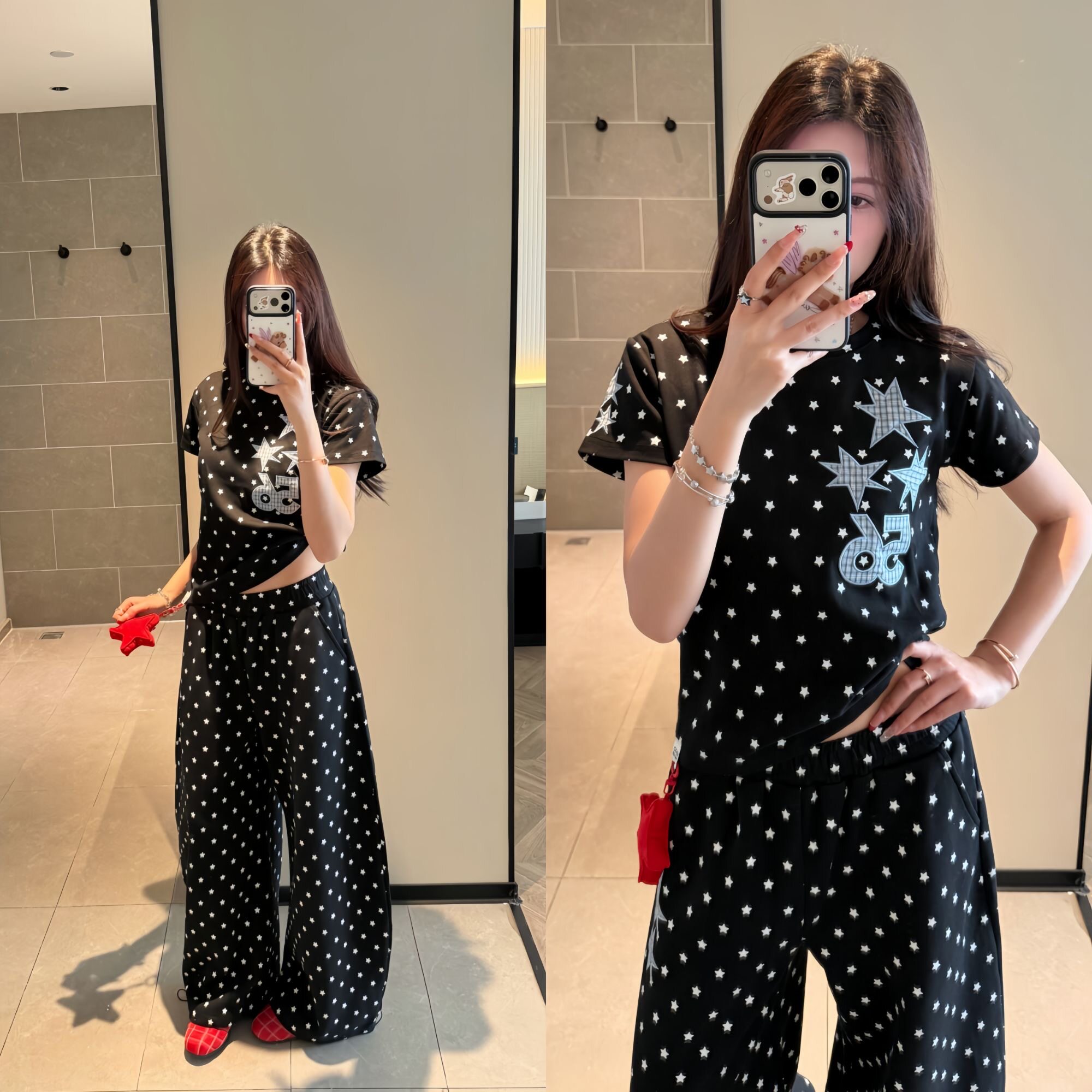 套装 AMER 复古韩系星星满印波点刺绣正肩显瘦T恤卫裤
