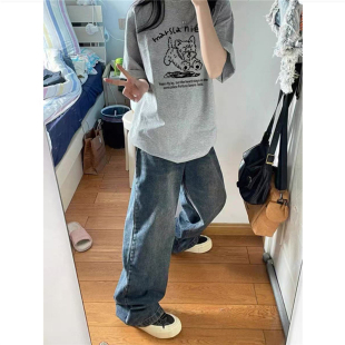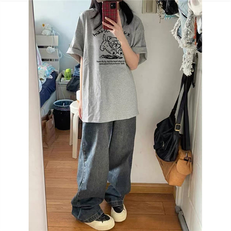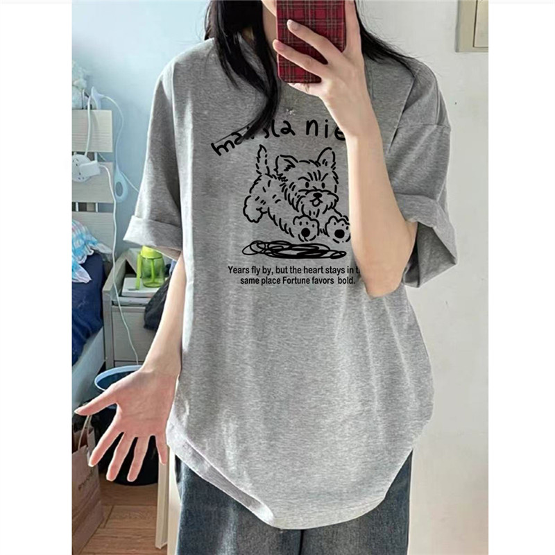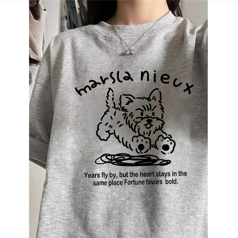 慵懒风半袖 纯棉美式 宽松韩版 t恤女夏季 上衣 复古狗狗正肩灰色短袖