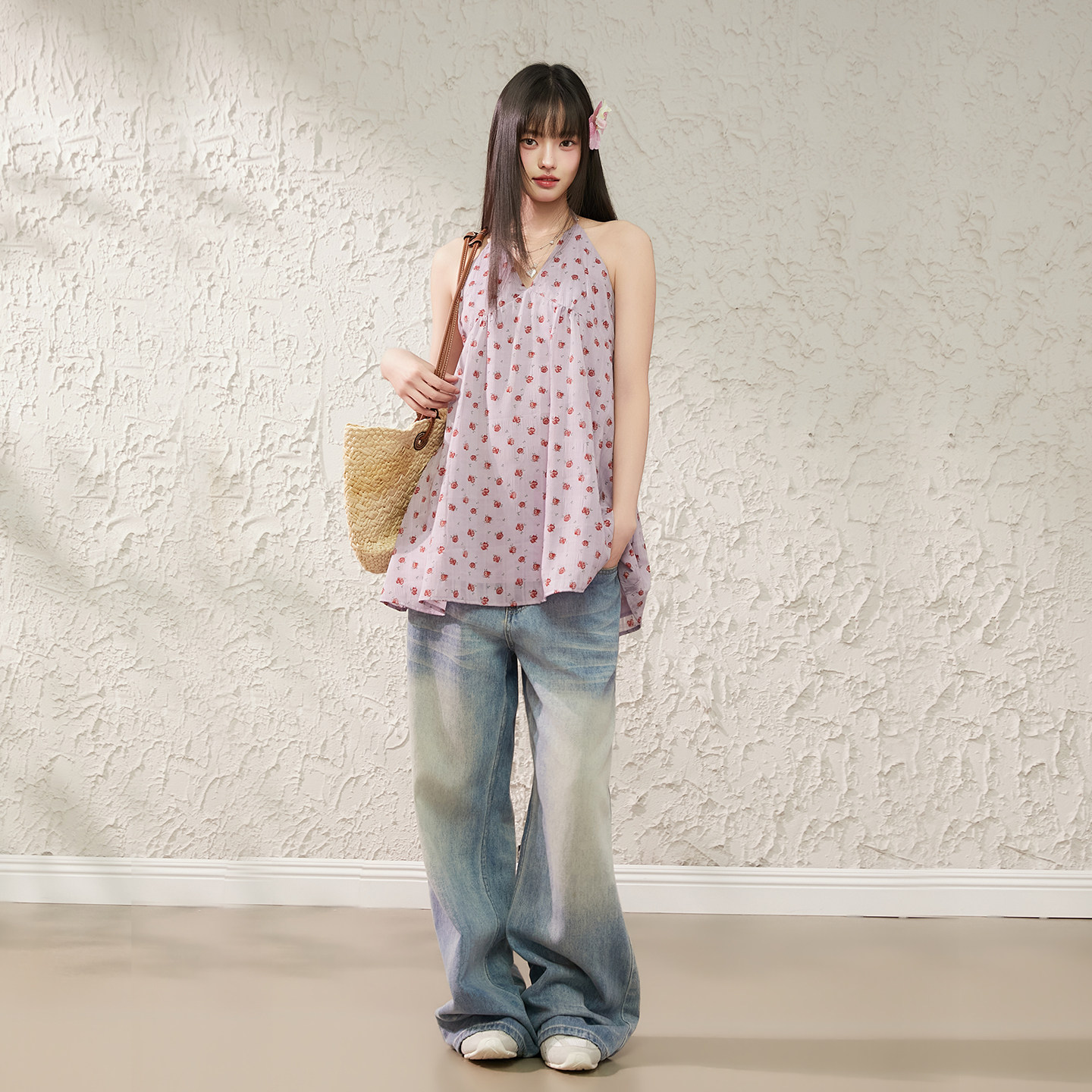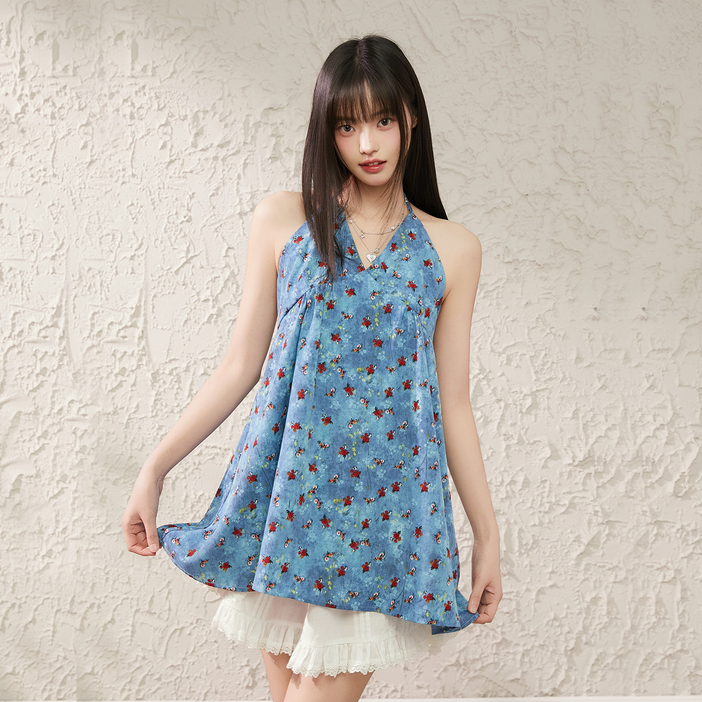 King 背心显瘦气质短裙 Prince度假风碎花挂脖连衣裙女夏V领无袖