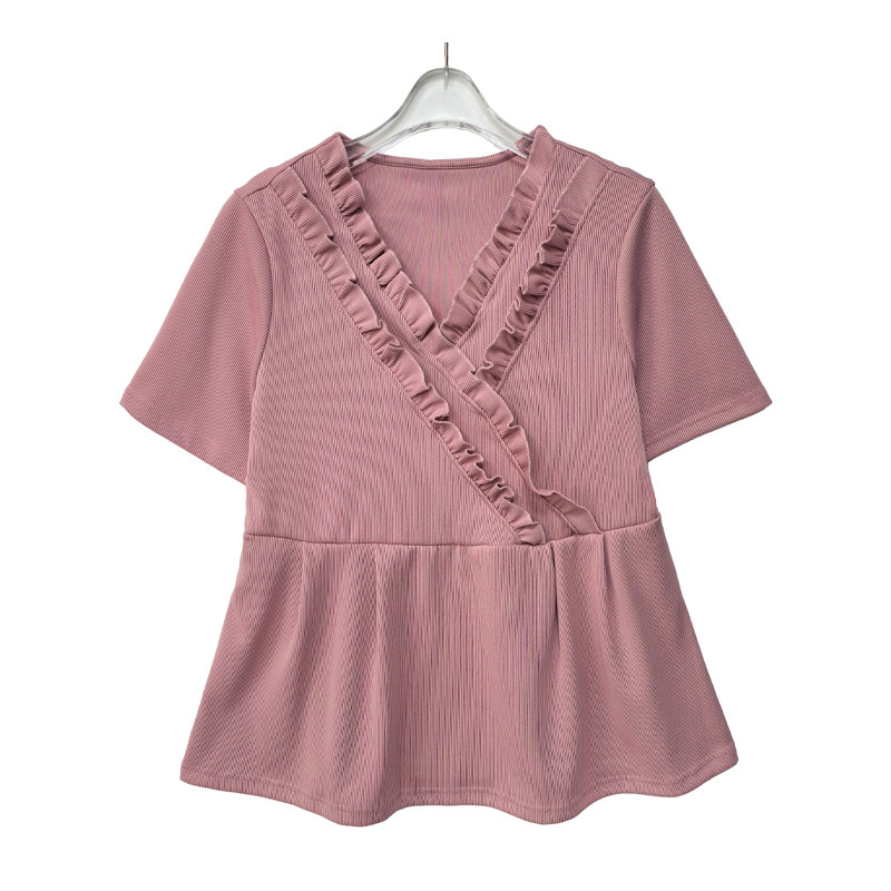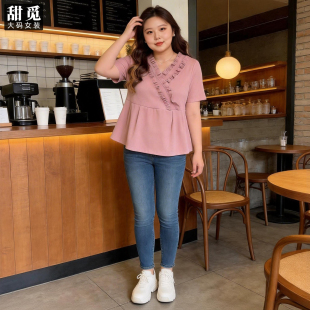 胖mm300斤胖妹妹淑女气质显瘦花边V领短袖 夏装 T恤 女装 甜觅特大码