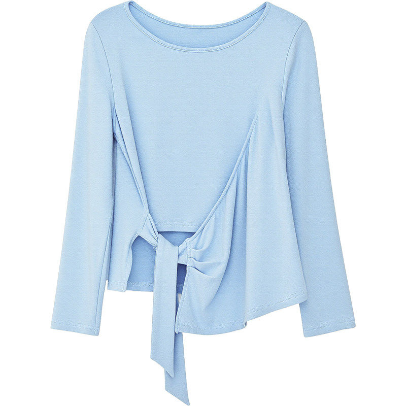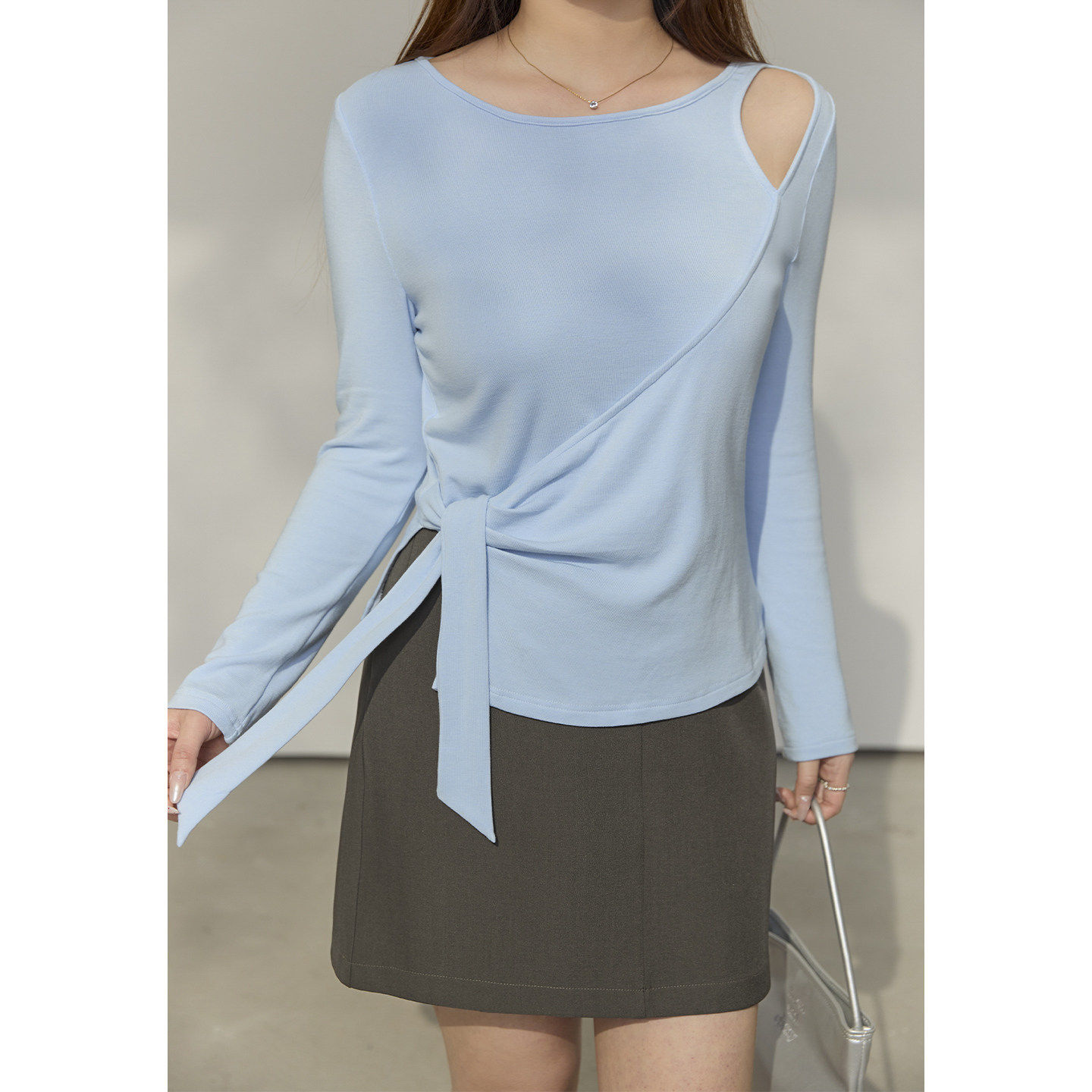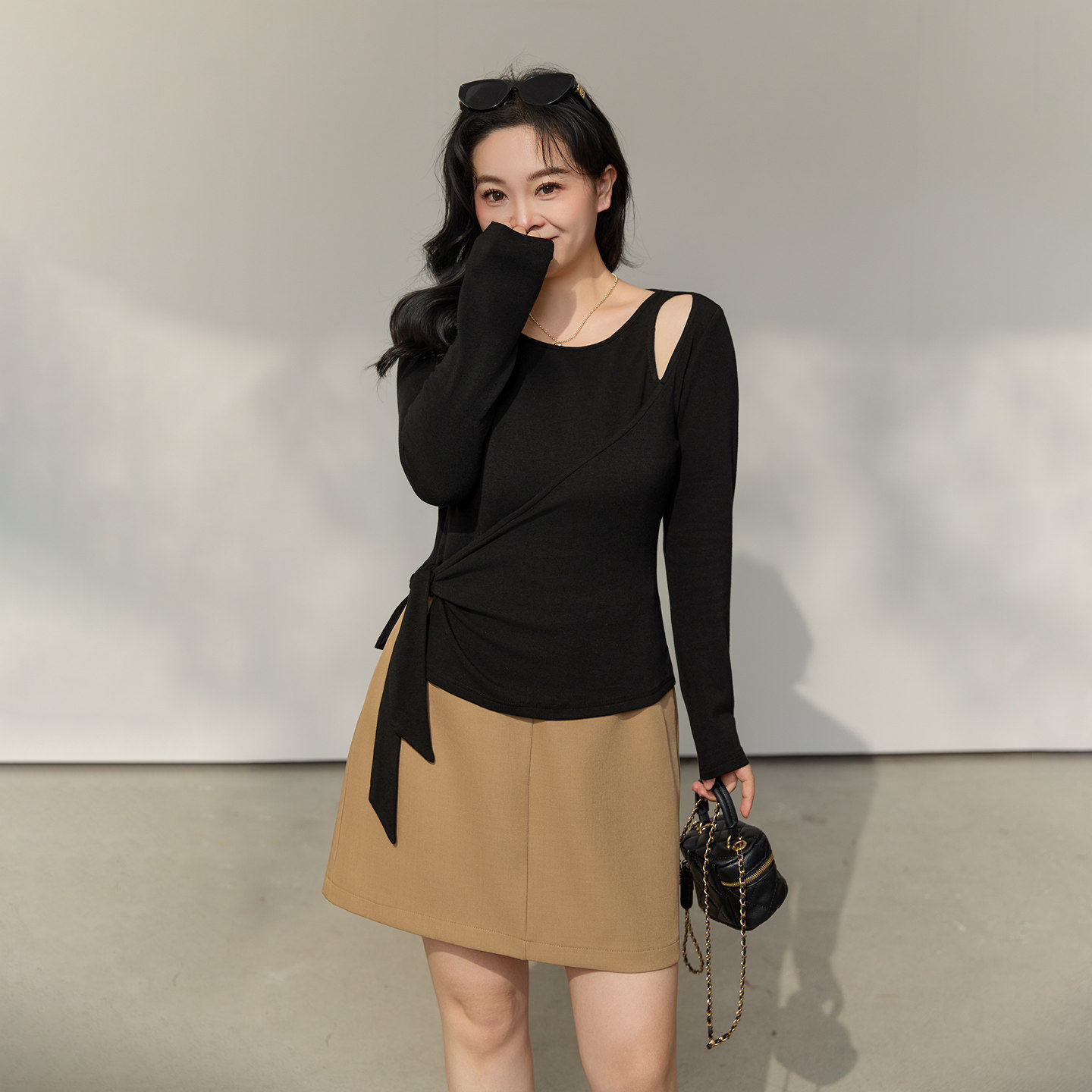 设计感不规则绑带镂空修身 微胖mm春季 针织T恤 百分百女装 大码